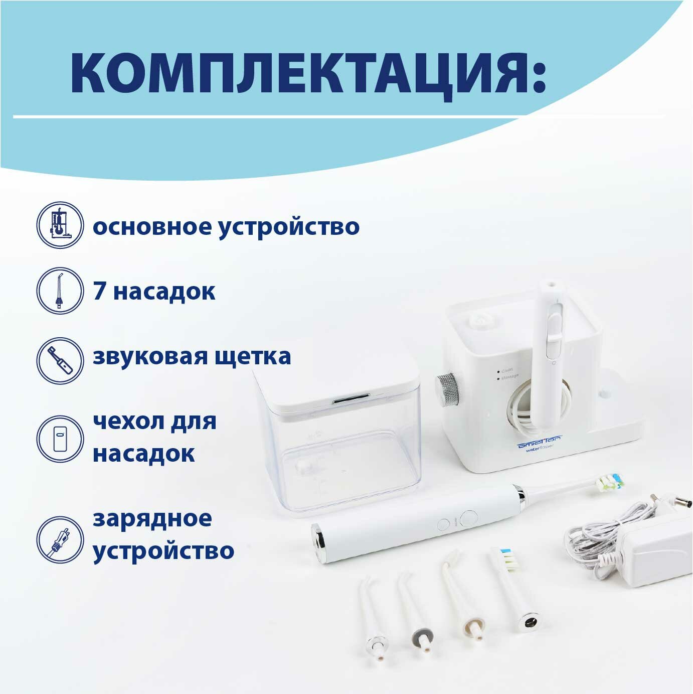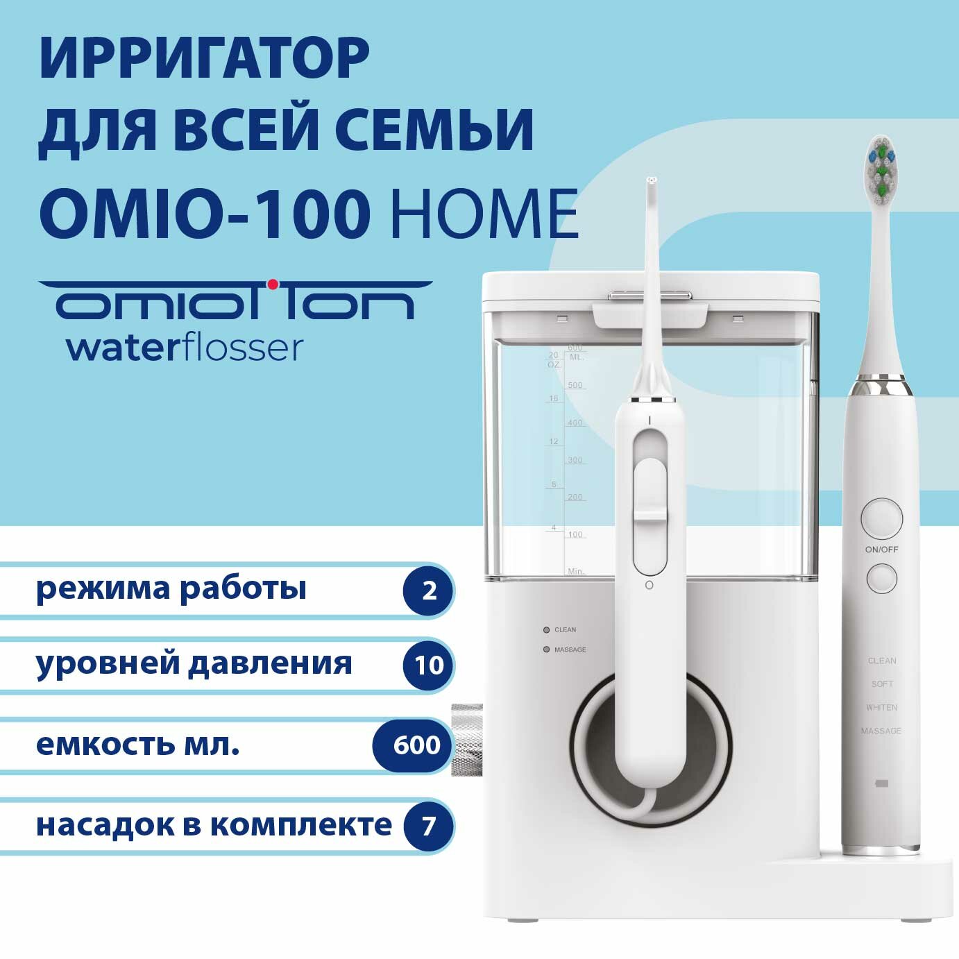 Ирригатор для полости рта стационарный + электрическая зубная щетка звуковая OMIO-100 интересное: