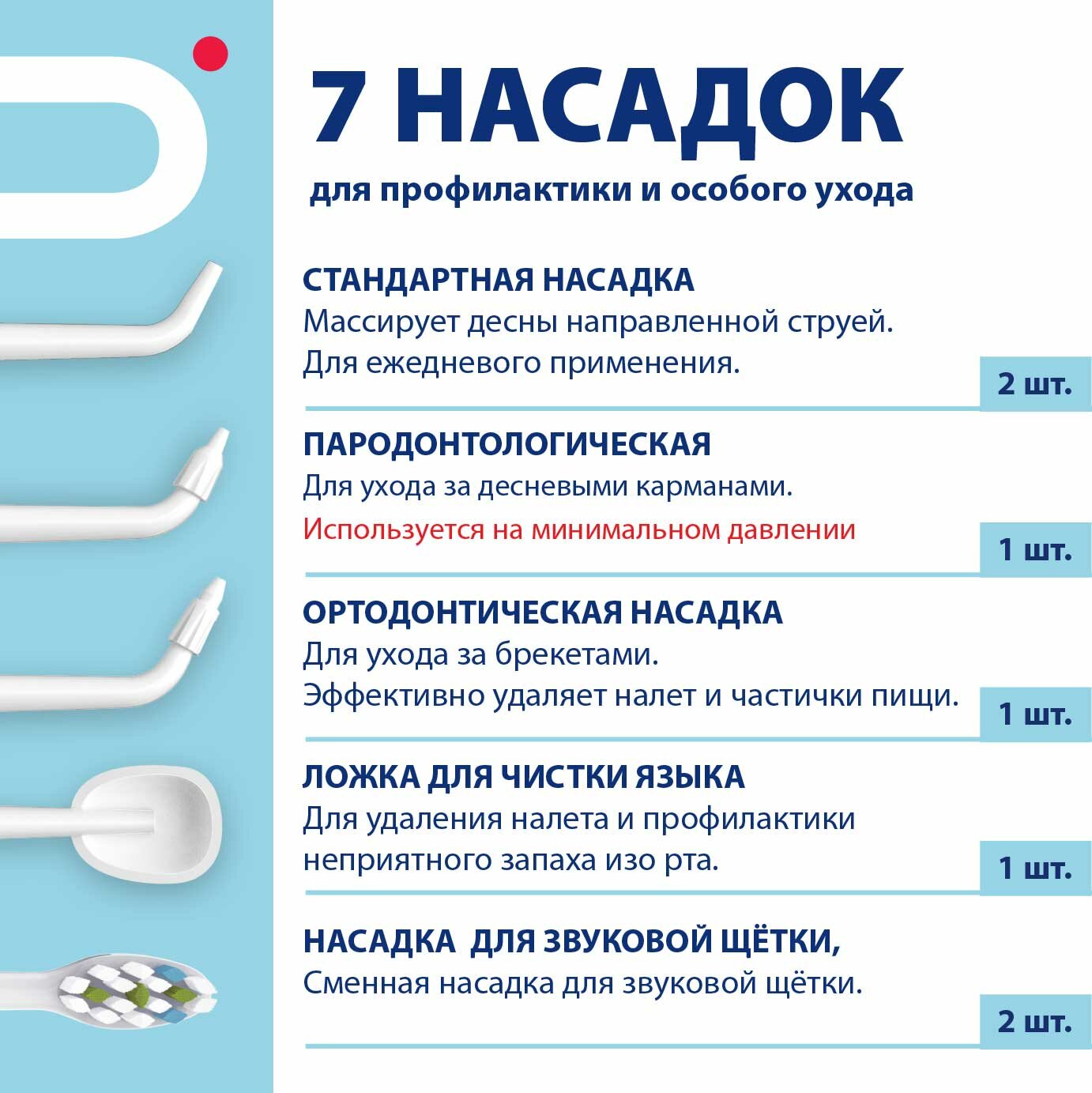 | Насадки | для чистки имплантов и коронок / ортодонтическая (для брекетов) / пародонтологическая (для десен) |