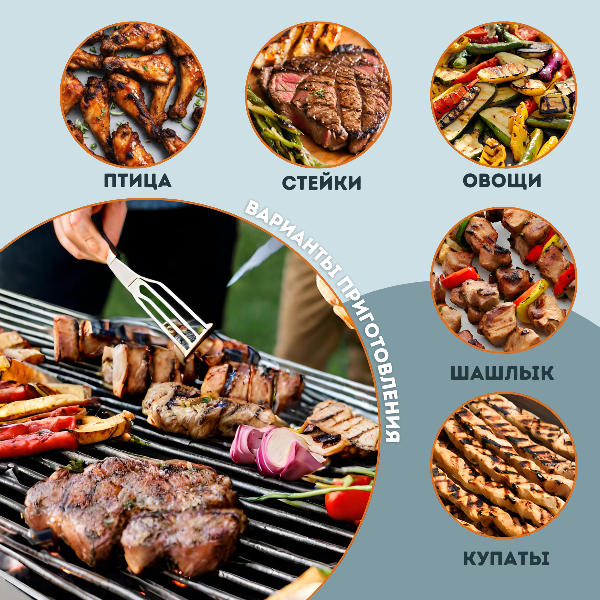 | Особенности | колёса / крышка / переносной / поддон для сбора жира / решетка / столик / термометр |