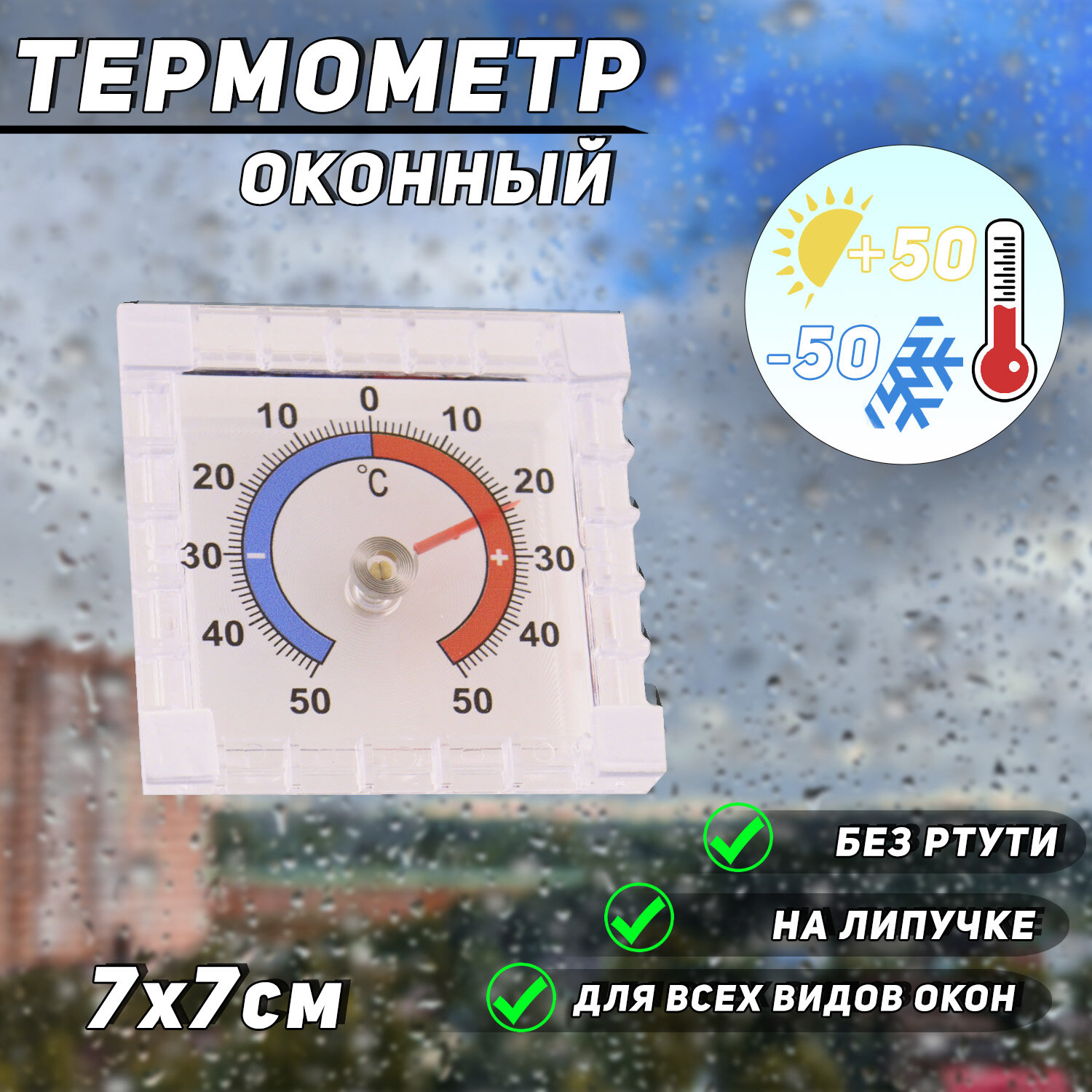 Термометр уличный/оконный биметаллический для дома и теплицы (пластиковый, без ртути, 7.5*7.5см) "CH" интересное: