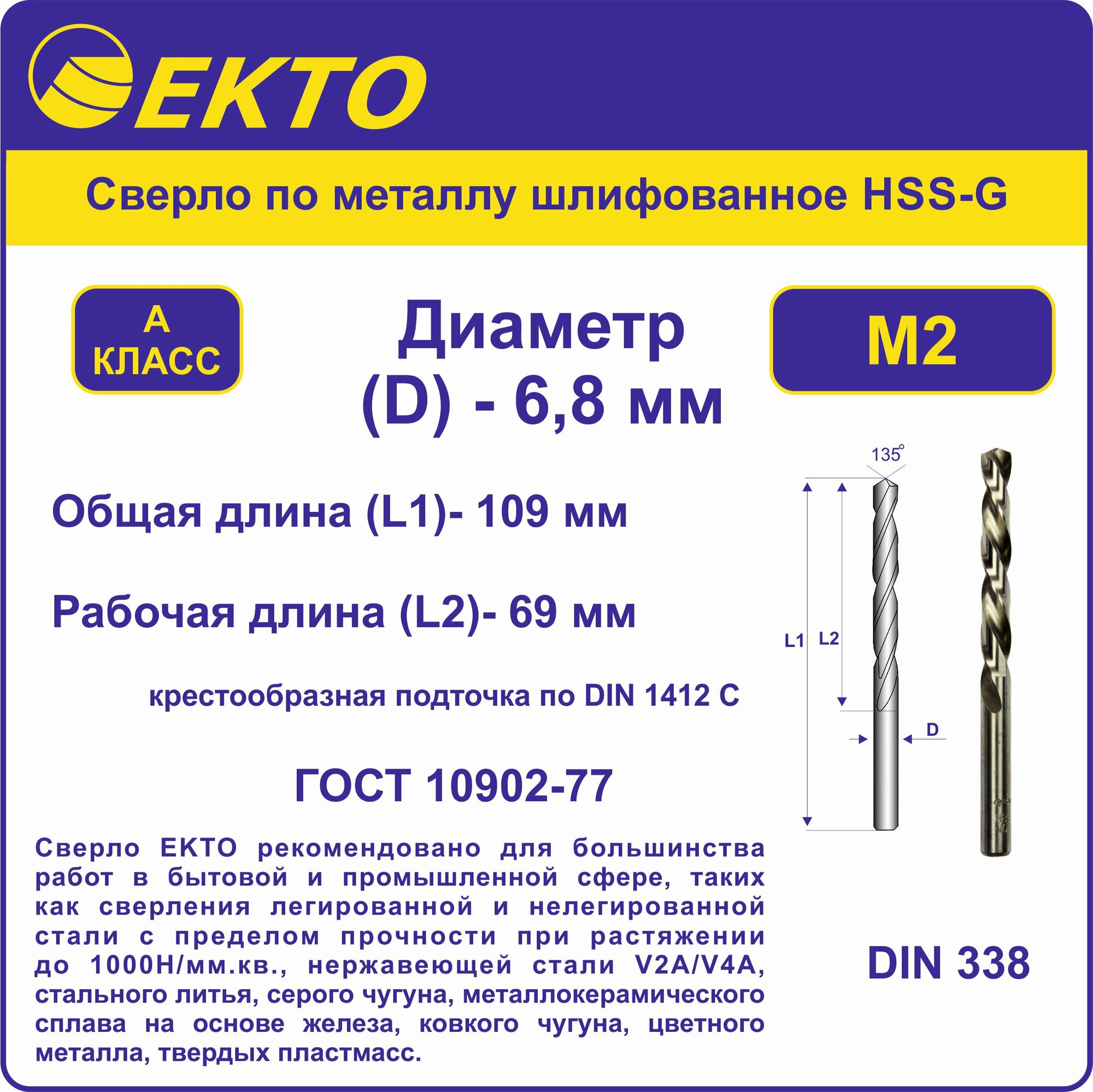 Сверло по металлу шлифованное HSS-G M2 DIN 338 6,8 мм цилиндрический хвостовик EKTO интересное: