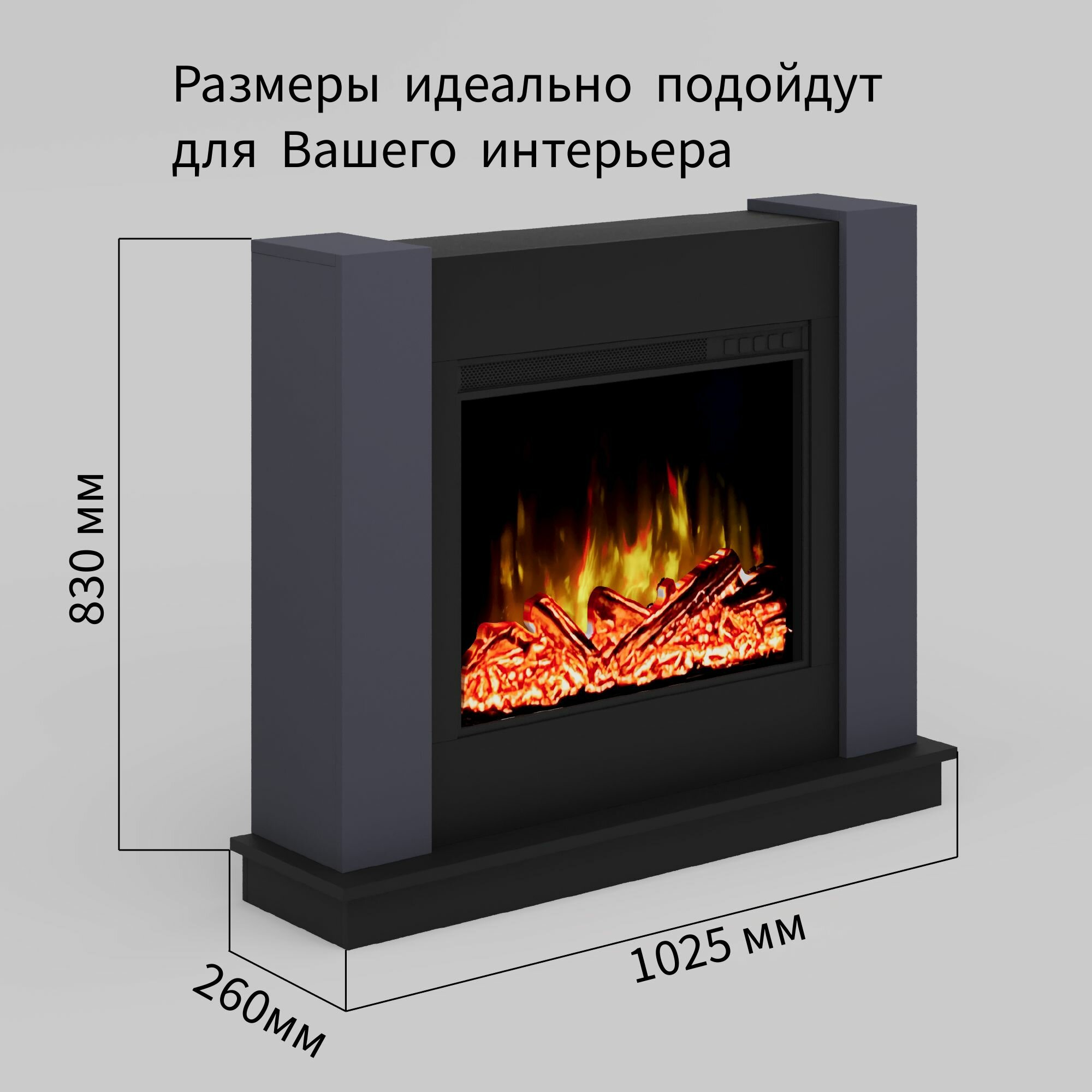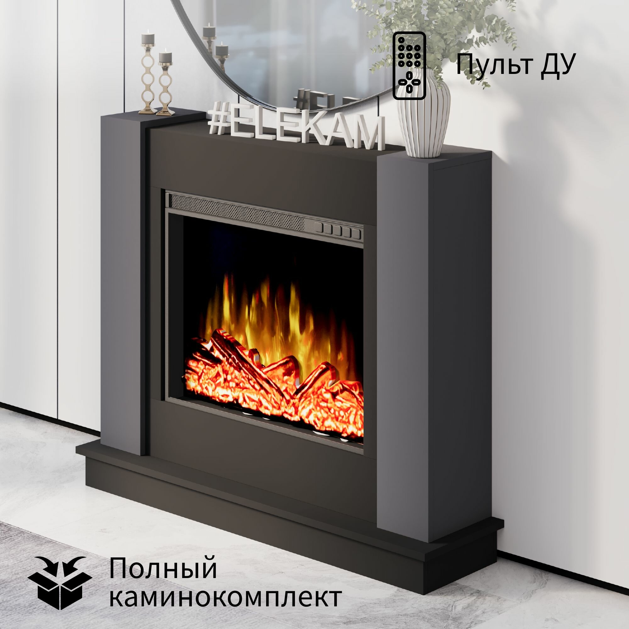 Электрический камин ELEKAM LIGHT standart в цвете графит+черный с пультом, обогревом и звуком потрескивания дров (Электрокамин)