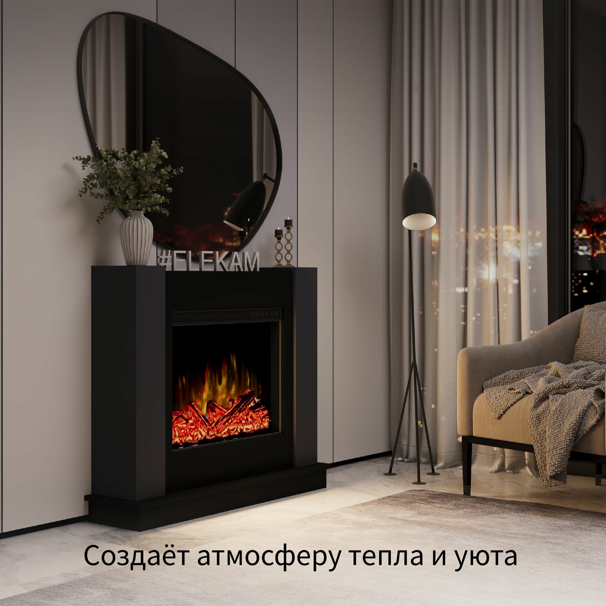 Камин электрический напольный ELEKAM LIGHT max с очагом и порталом, с пультом, обогревом и имитацией огня (Электрокамин)