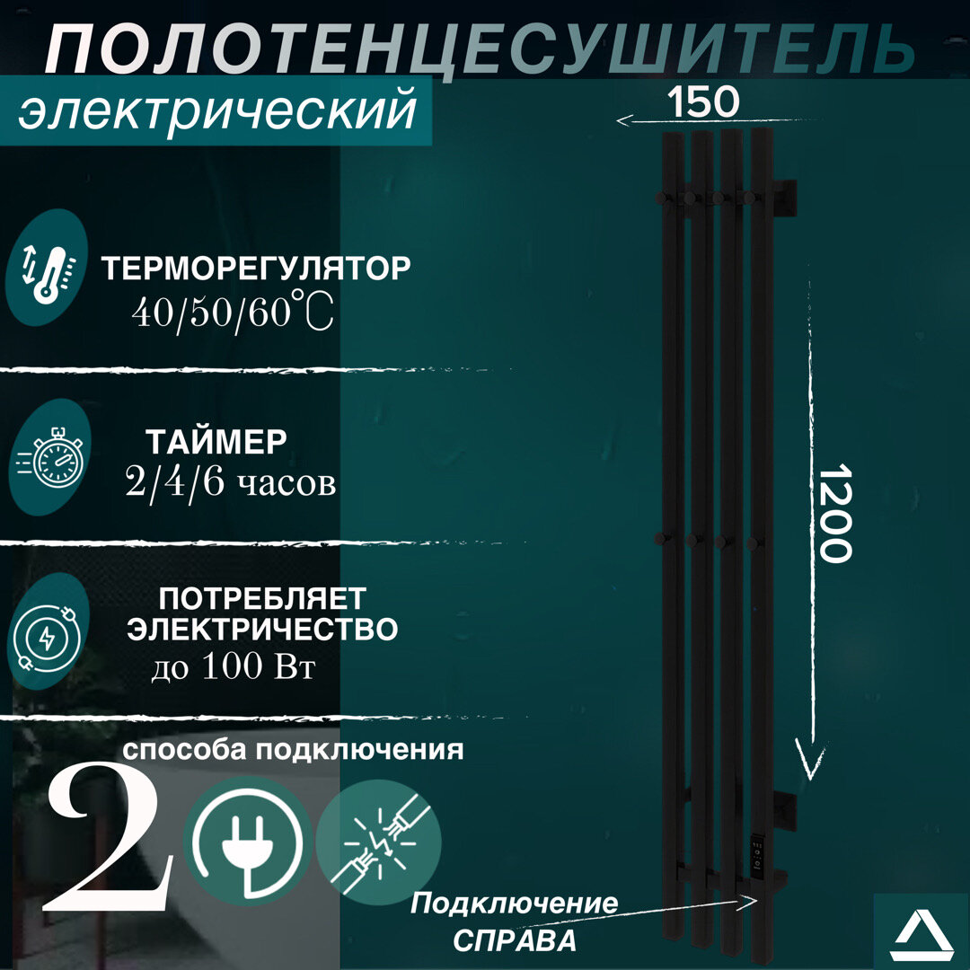 Купить Полотенцесушитель электрический TermoPrime 1200*2050мм черный 8 крючков, 4 секции подключение справа