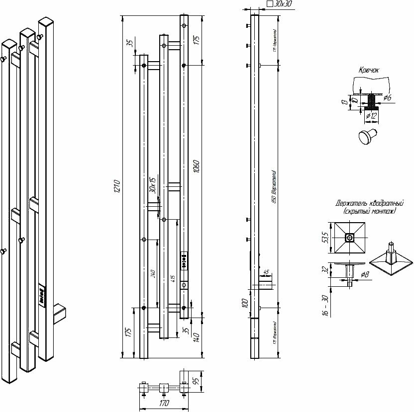 | Дополнительная информация | Полотенцесушитель электрический - 1 шт, клемы для скрытого подключения - 3 шт, кабель с вилкой(уже установлен) - 1 шт, телескопический держатель - 4 шт, паспорт изделия - 1 шт |