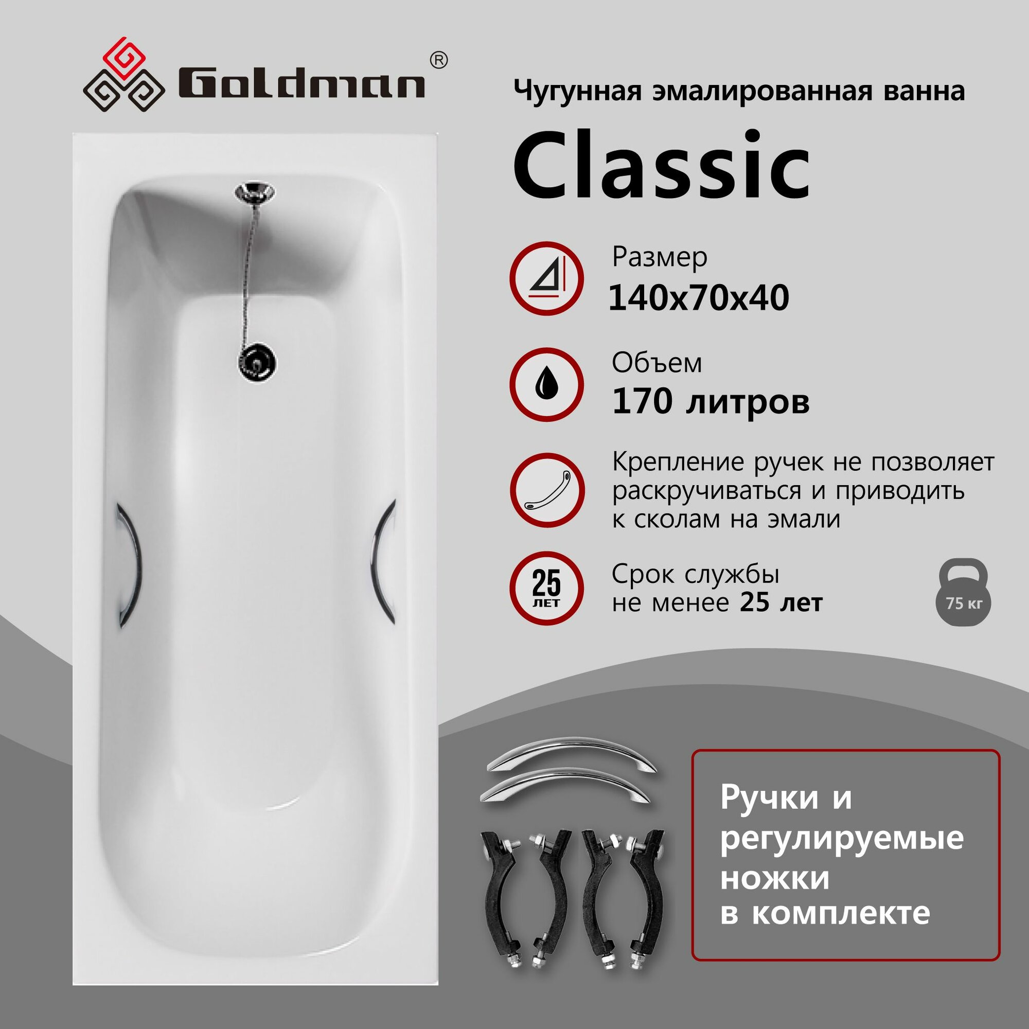 Чугунная ванна Goldman Classic 140x70x40 с ручками интересное: