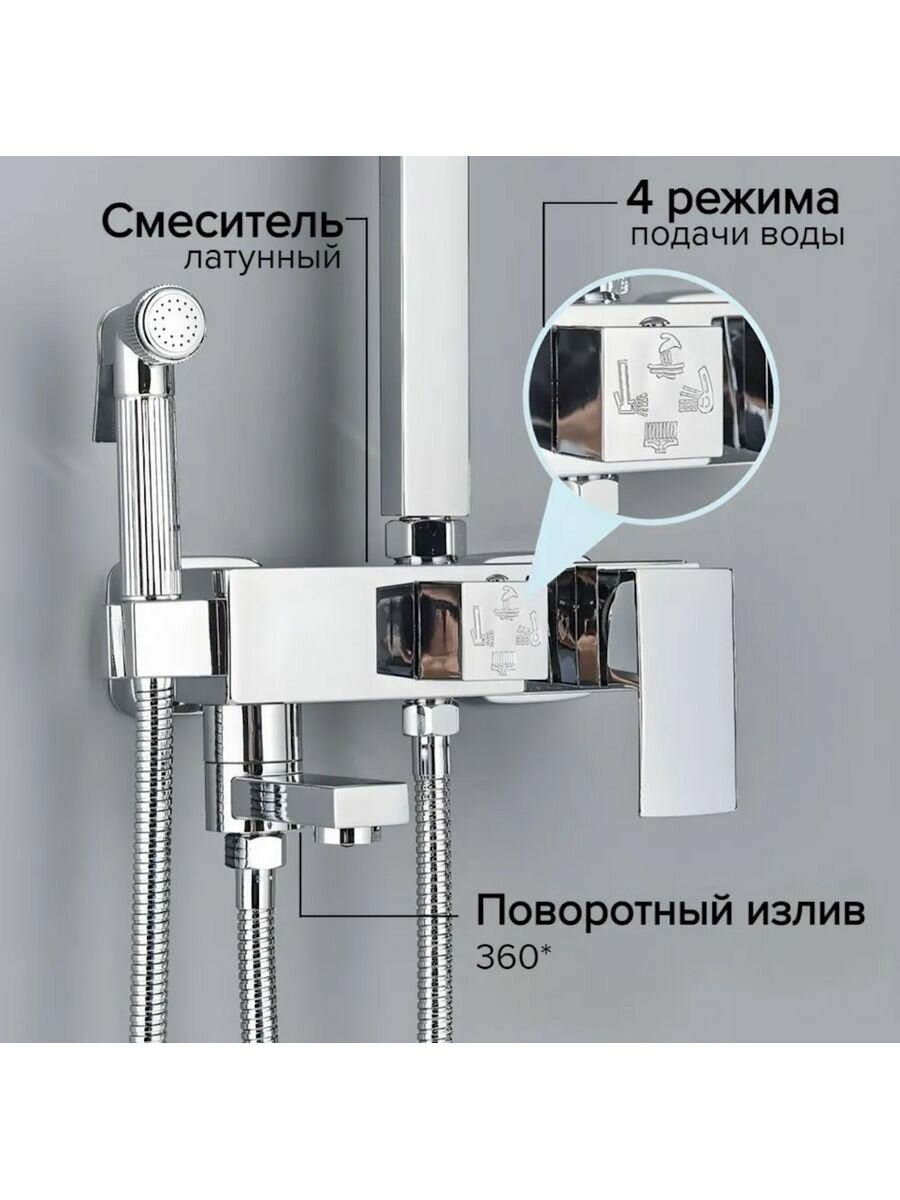 | Особенности | держатель душевой лейки / поворотный излив / регулируемый верхний душ |