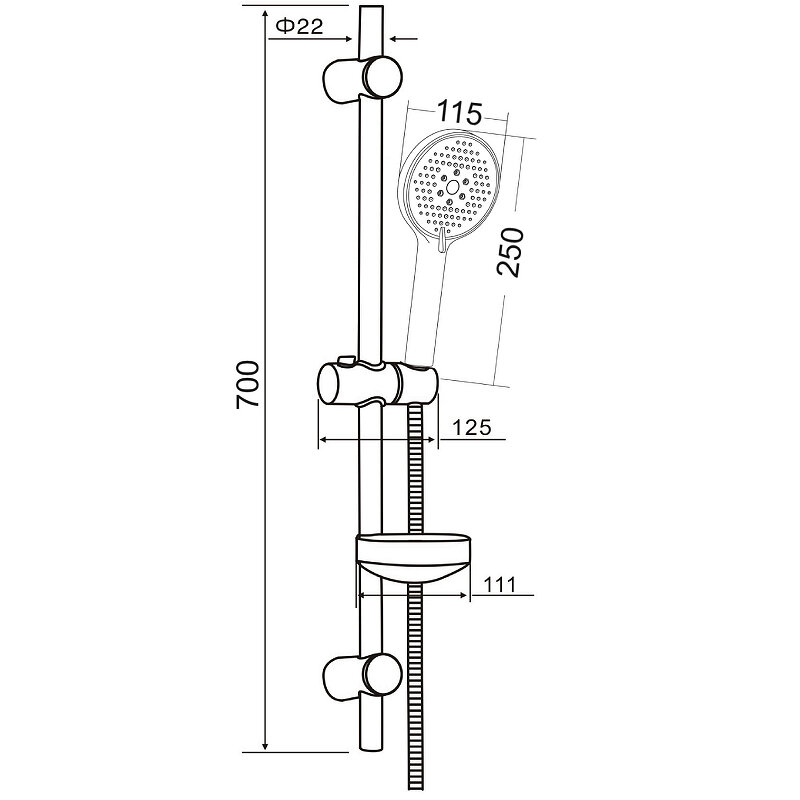 | Комплектация | верхний душ / держатель лейки / душевая штанга / лейка / мыльница / переключатель потоков / Смеситель / шланг |
