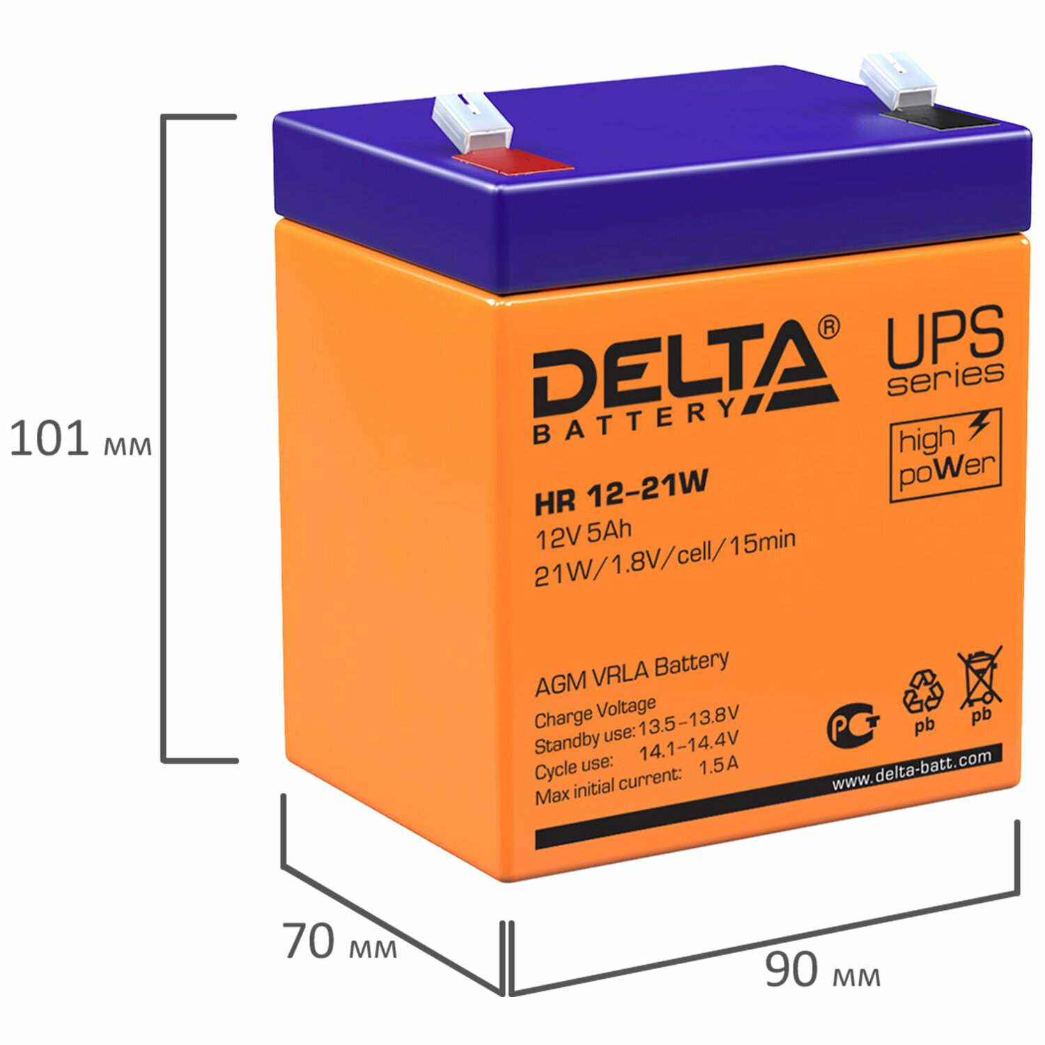 Аккумуляторная батарея для ИБП любых торговых марок, 12 В, 5 Ач, 90х70х101 мм, DELTA, HR 12-21 W 1 шт . интересное: