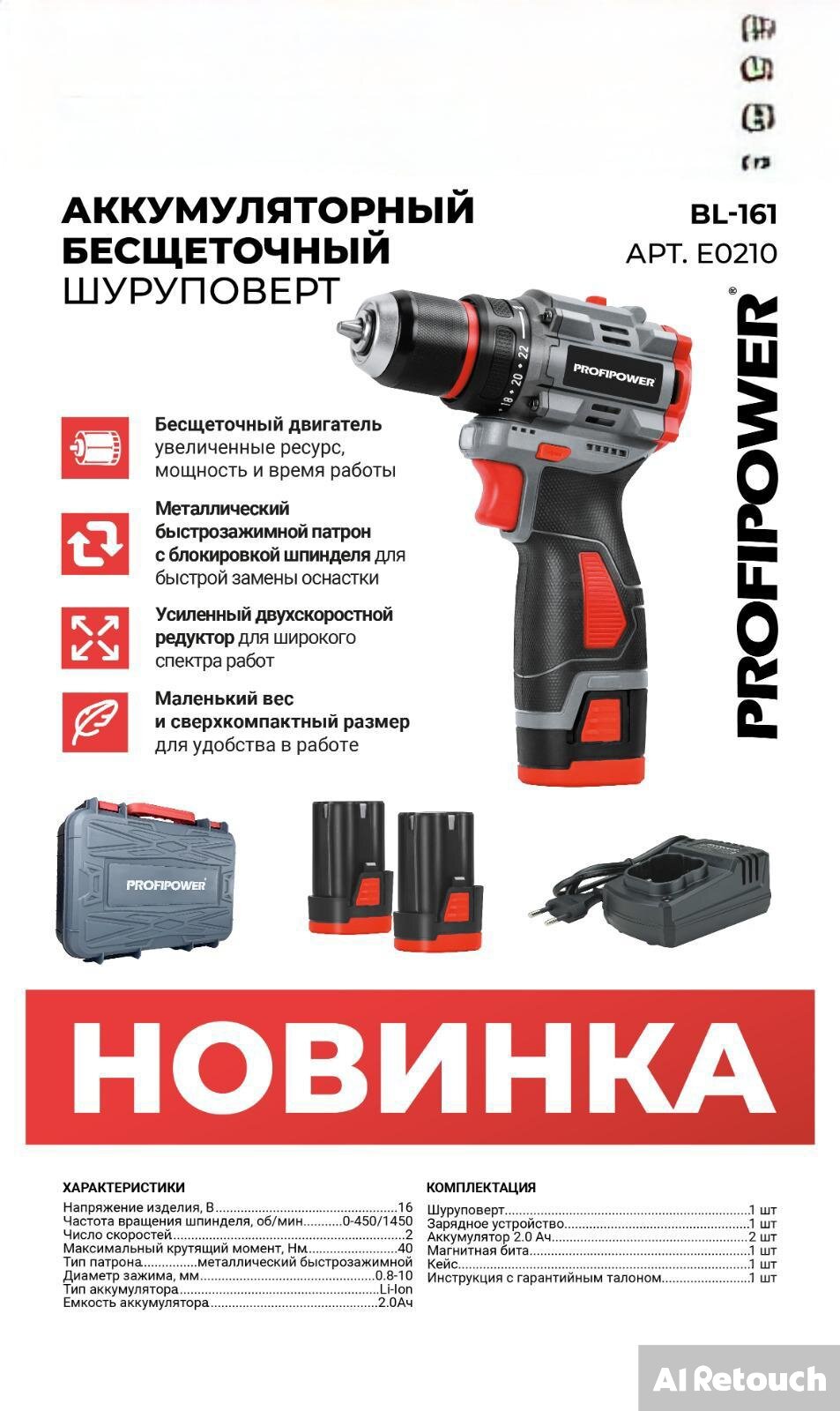 Аккумуляторный бесщёточный шуруповёрт Profipower 16В 2Ач (метал.патрон,40Н/м,бита,кейс) интересное: