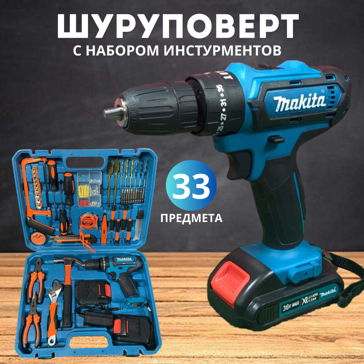 Купить Аккумуляторный шуруповерт с набором инструментов 36v