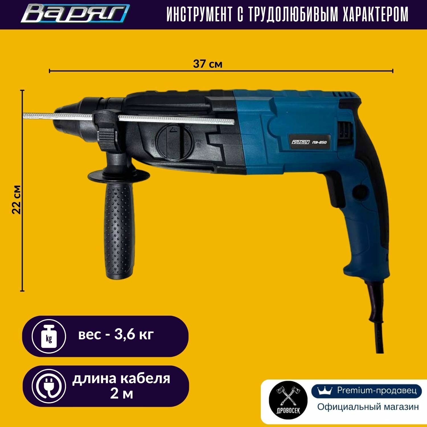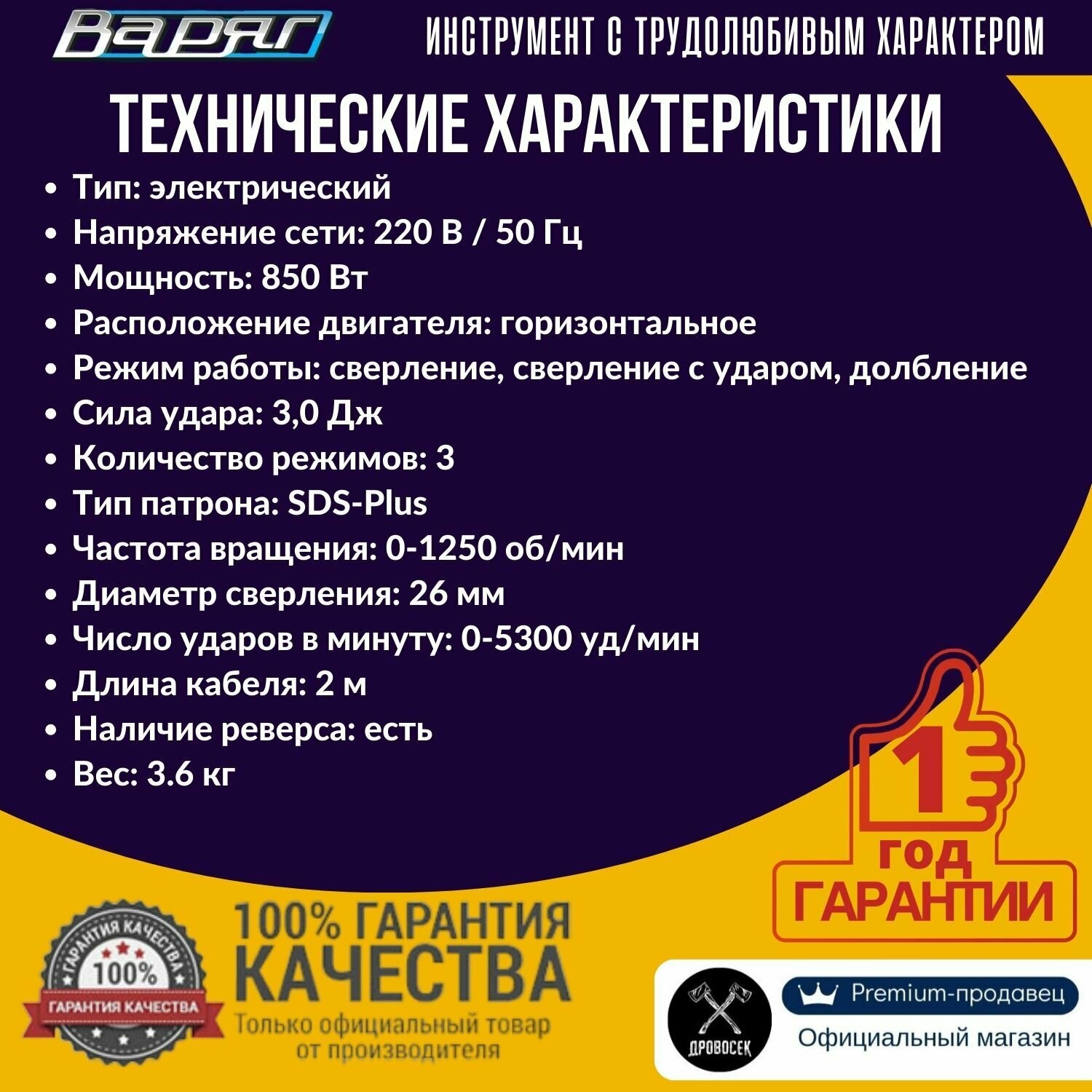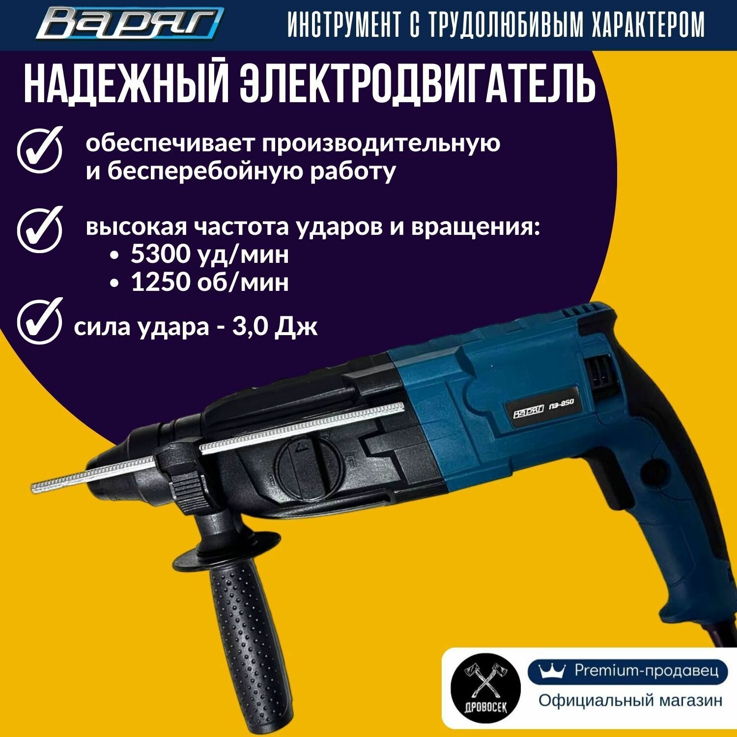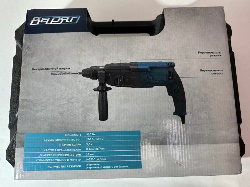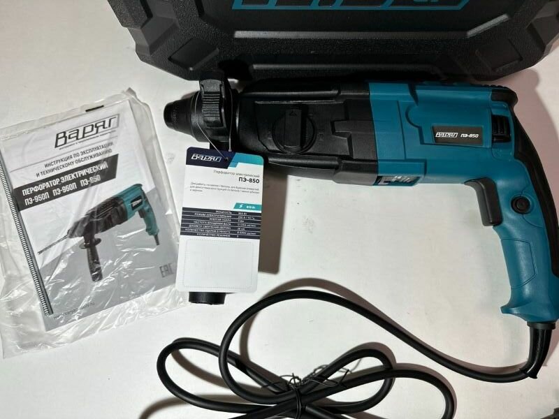 Перфоратор SDS-Plus варяг ПЭ-850 электрический (850Вт, 0-1250об/мин, 0-5300уд/мин, 3,0Дж, 3 реж, SDS+) в кейсе, от сети интересное: