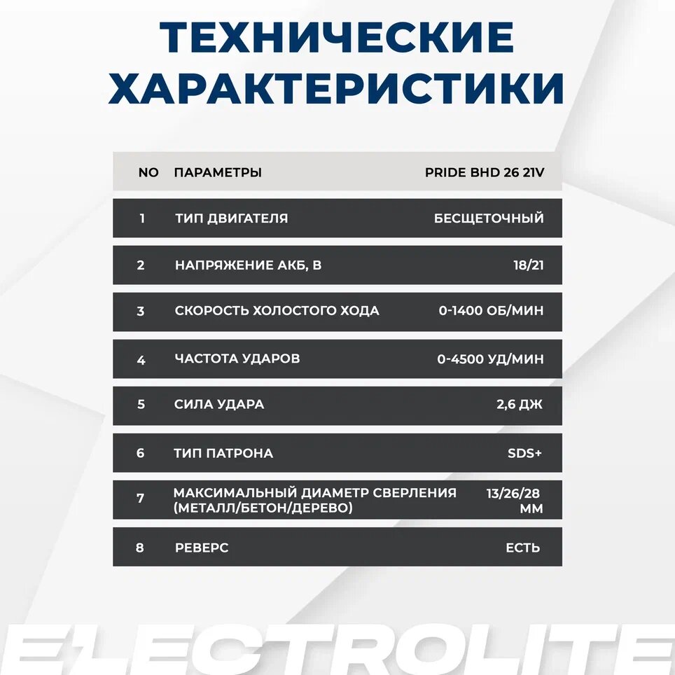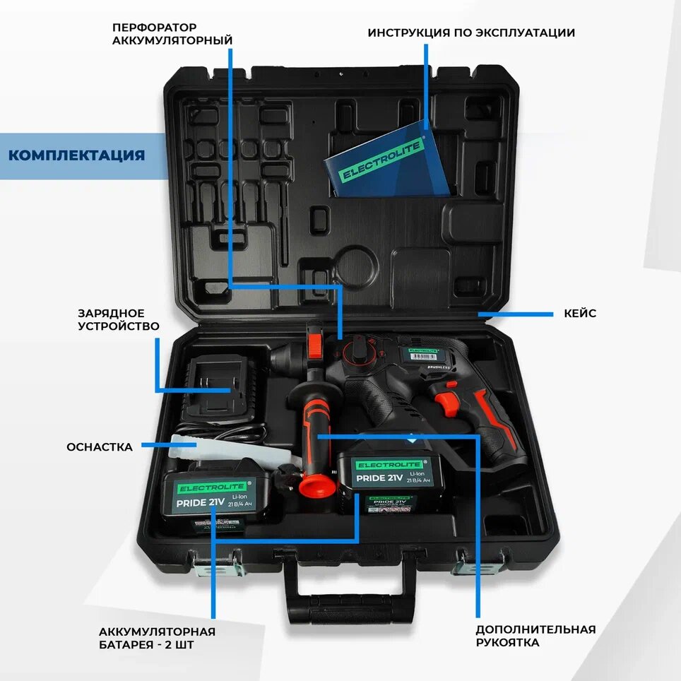 Перфоратор аккумуляторный / перфоратор SDS-PLUS / бесщеточный аккумуляторный ELECTROLITE BHD26-21V-EL ( 2 акб по 4 А*ч, 2,6 Дж, кейс + оснастка ) интересное: