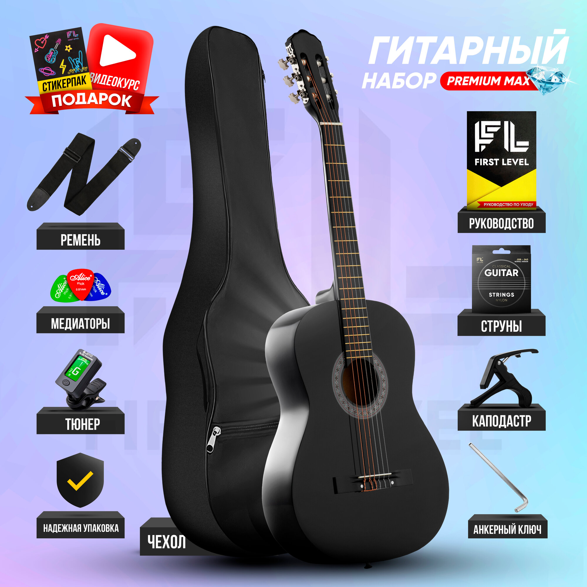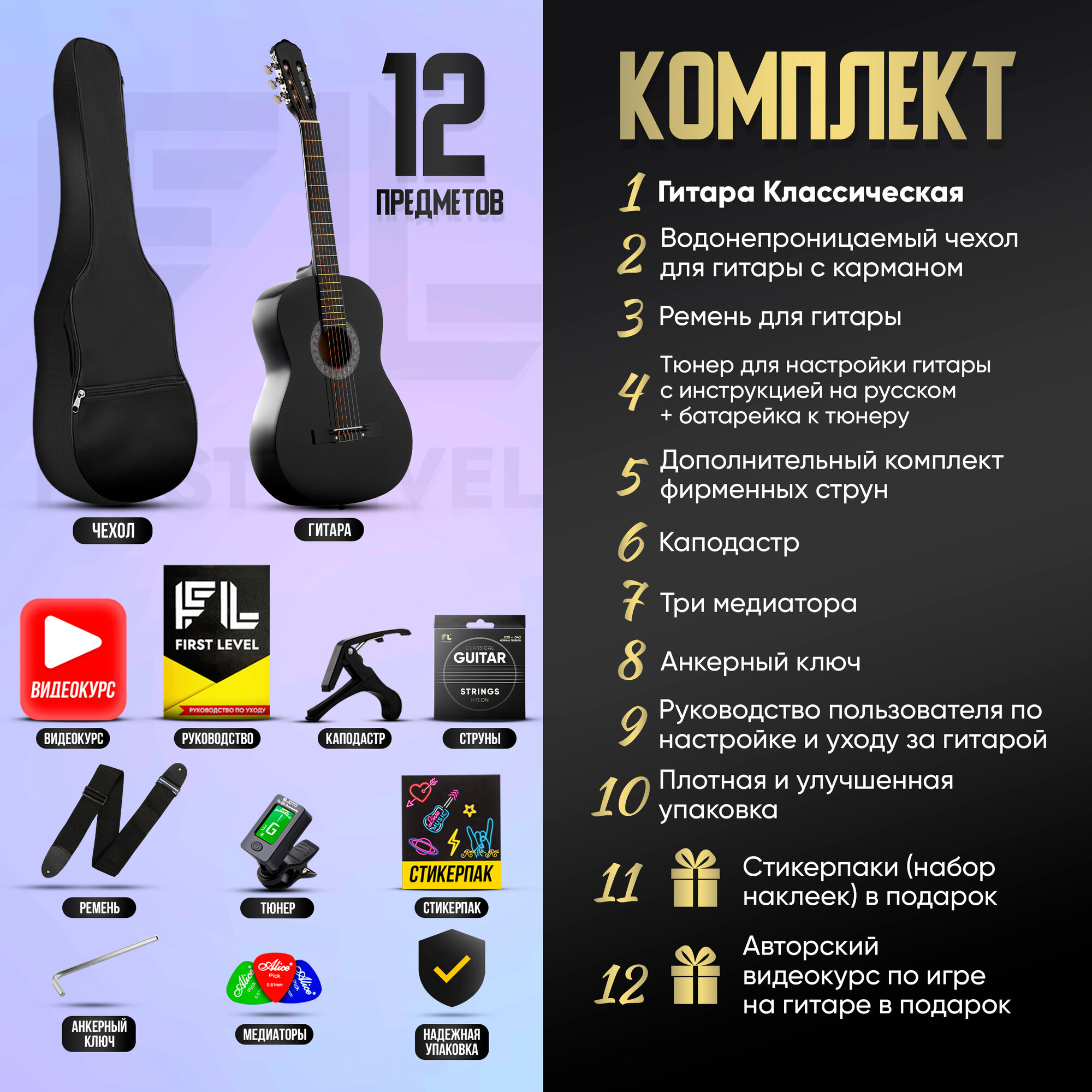 | В комплекте | 1. Гитара классическая, размер 7/8; 2. Водонепроницаемый чехол для гитары c карманом; 3. Дополнительный комплект фирменных струн; 4. Ремень для гитары; 5. Тюнер для настройки гитары с инструкцией на русском языке + батарейка к тюнеру; 6. Каподастр; 7. Три медиатора; 8. Анкерный ключ; 9. Руководство пользователя по настройке и уходу за гитарой + Авторский видео курс по игре на гитаре в подарок! 10. Стикерпаки (набор наклеек) в подарок! |