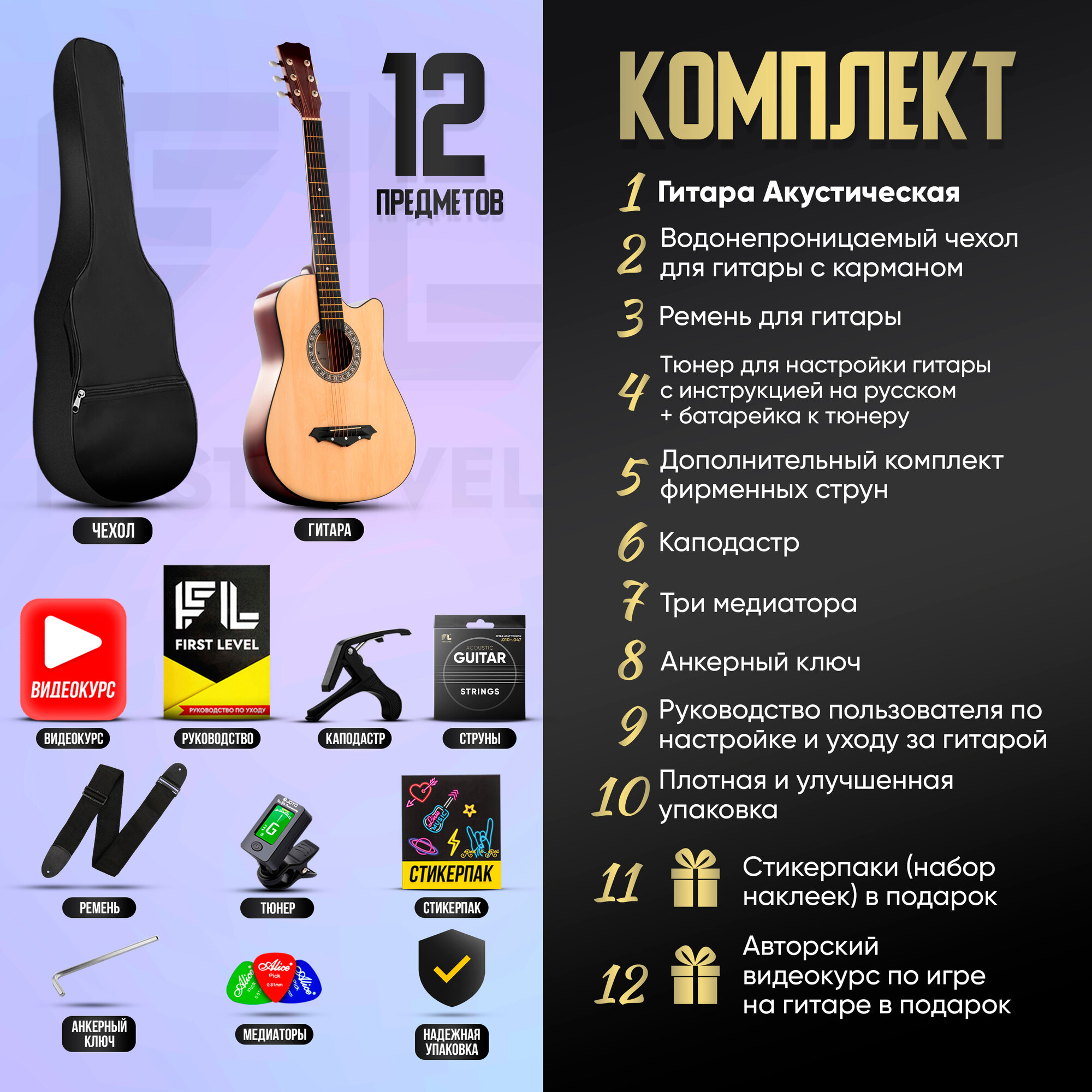 | В комплекте | 1. Гитара акустическая Belucci BC3810, размер 7/8; 2. Водонепроницаемый чехол для гитары c карманом; 3. Дополнительный комплект фирменных струн; 4. Ремень для гитары; 5. Тюнер для настройки гитары с инструкцией на русском языке + батарейка к тюнеру; 6. Каподастр; 7. Три медиатора; 8. Анкерный ключ; 9. Руководство пользователя по настройке и уходу за гитарой + Авторский видео курс по игре на гитаре в подарок! 10. Стикерпаки (набор наклеек) в подарок! |
