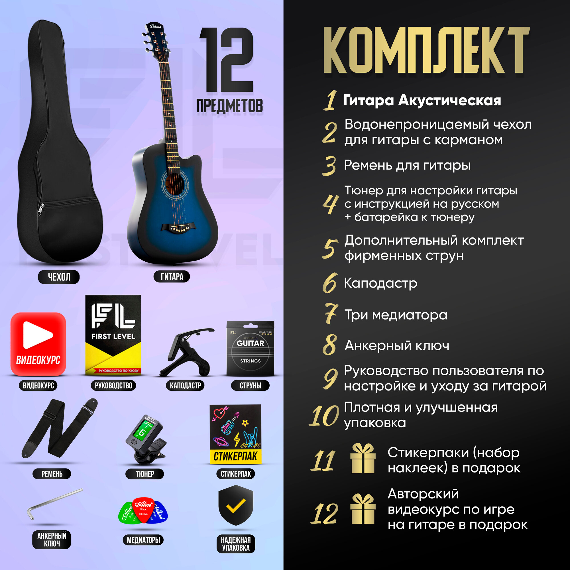 | В комплекте | 1. Гитара акустическая Belucci BC3810, размер 7/8; 2. Водонепроницаемый чехол для гитары c карманом; 3. Дополнительный комплект фирменных струн; 4. Ремень для гитары; 5. Тюнер для настройки гитары с инструкцией на русском языке + батарейка к тюнеру; 6. Каподастр; 7. Три медиатора; 8. Анкерный ключ; 9. Руководство пользователя по настройке и уходу за гитарой + Авторский видео курс по игре на гитаре в подарок! 10. Стикерпаки (набор наклеек) в подарок! |