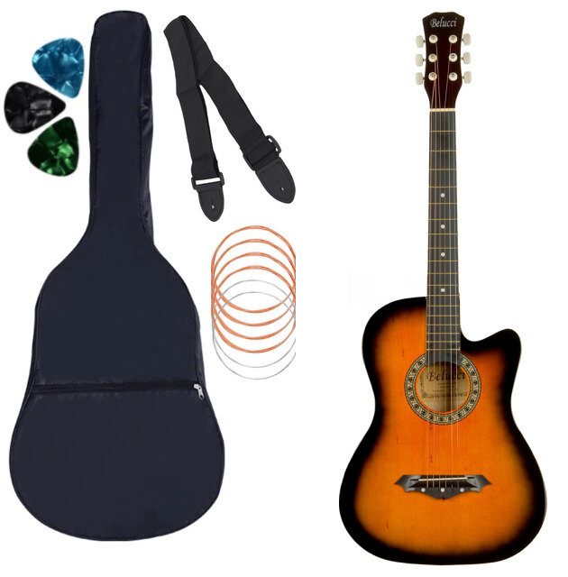 Купить В комплекте: Гитара акустическая 38"дюймов Belucci BС3810 глянцевая Чехол, Ремень, 6 Струн, Медиаторы, 7/8 санберст оранжевая,анкер