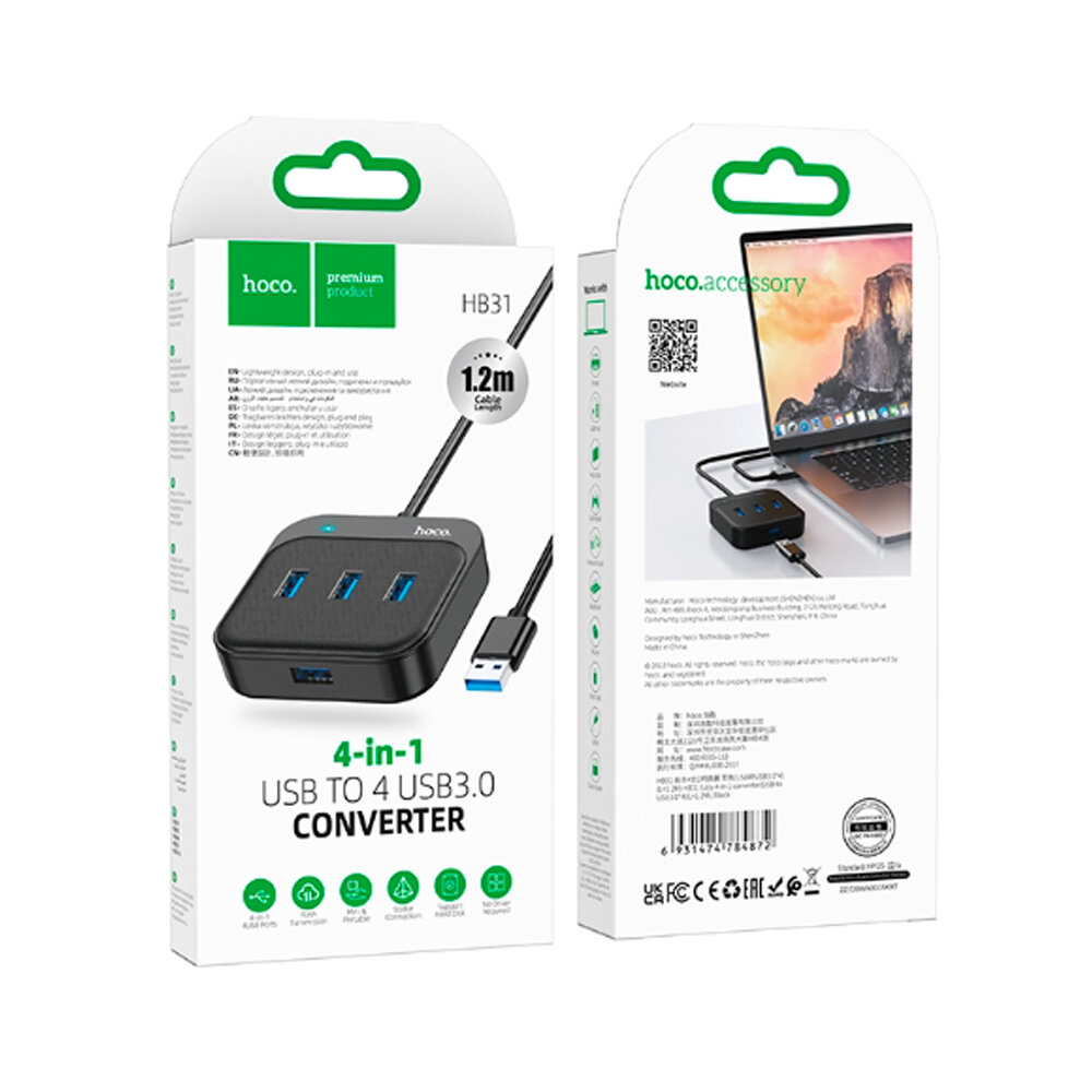 Купить USB HUB разветвитель HOCO HB31 Easy 4 в 1 USB3.0 (m) - 4xUSB3.0 (f), 1.2 м, черный