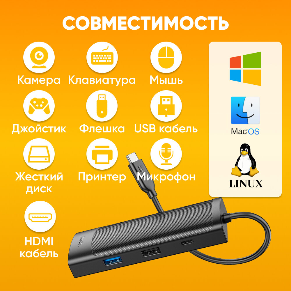 Адаптер-разветвитель, Хаб носо НВ43 7 в 1 USB-C с USB2.0 + USB3.0 + TYPE-C + HDMI / Поддержка SD/TF / Многопорт Переходник HUB USB type-c для ПК, ноутбука, Macbook интересное: