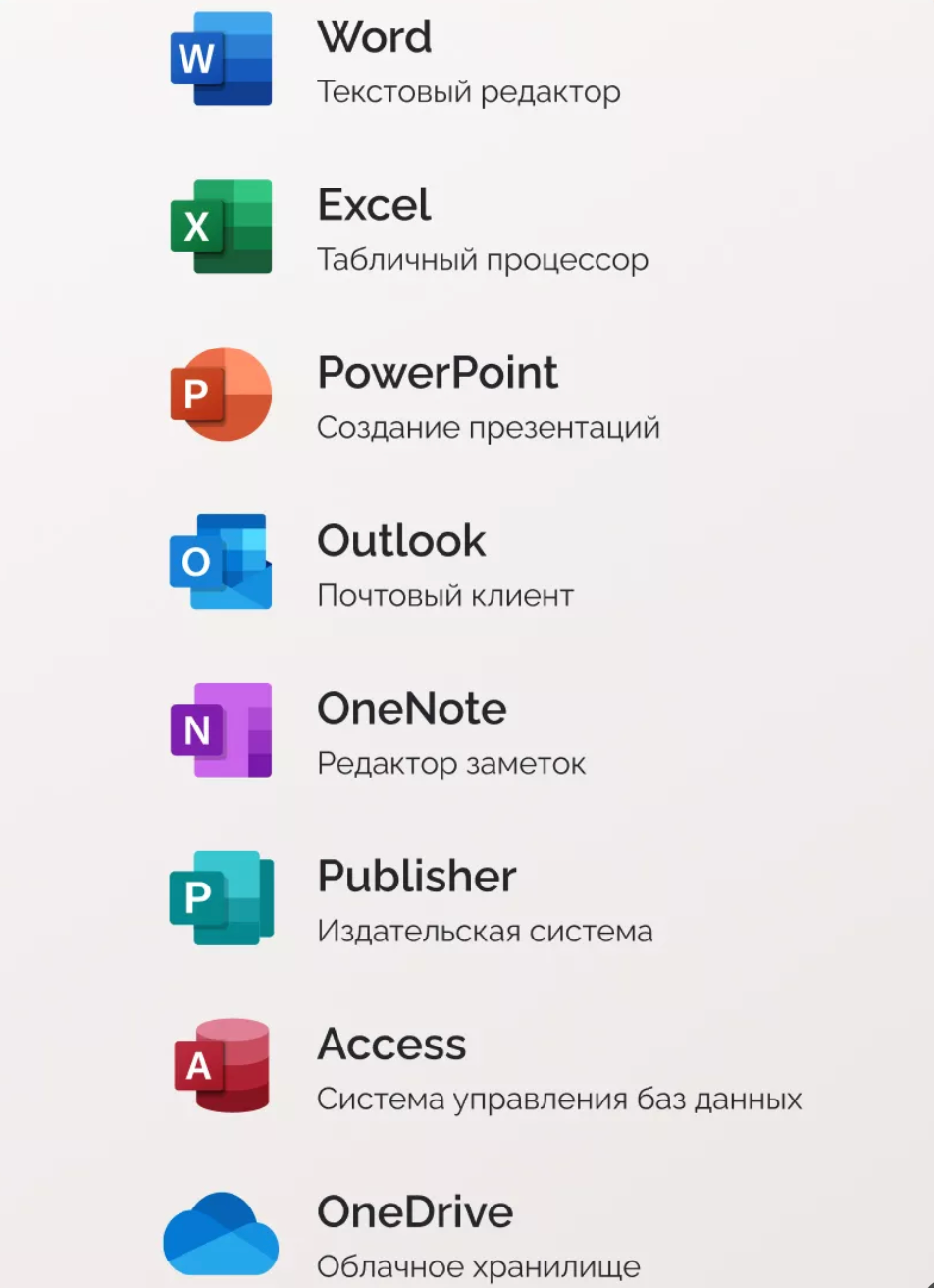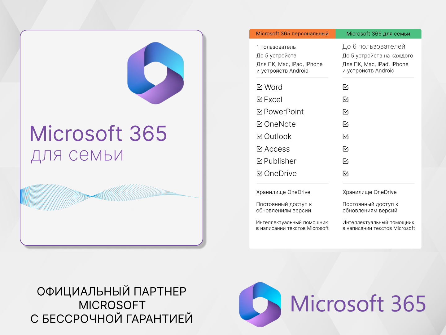 | Состав пакета | Word, Excel, PowerPoint, OneNote, Outlook, Teams, Microsoft Editor, Access (только ПК), Publisher (только ПК) - 1 ТБ в облачном хранилище OneDrive - 60 минут для звонков по Skype ежемесячно |