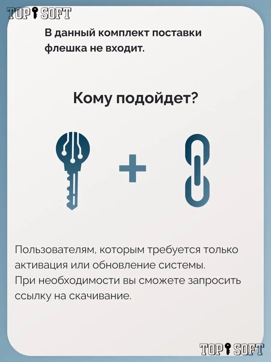 | Дополнительная информация | Ключ активации онлайн, привязка к Вашей учетной записи Microsoft - Привязка позволяет переносить лицензию на новое устройство при его смене на новое. Так же Вы без проблем восстановите лицензию при переустановки системы, Вам достаточно только войти в свою учетную запись Microsoft на ПК |
