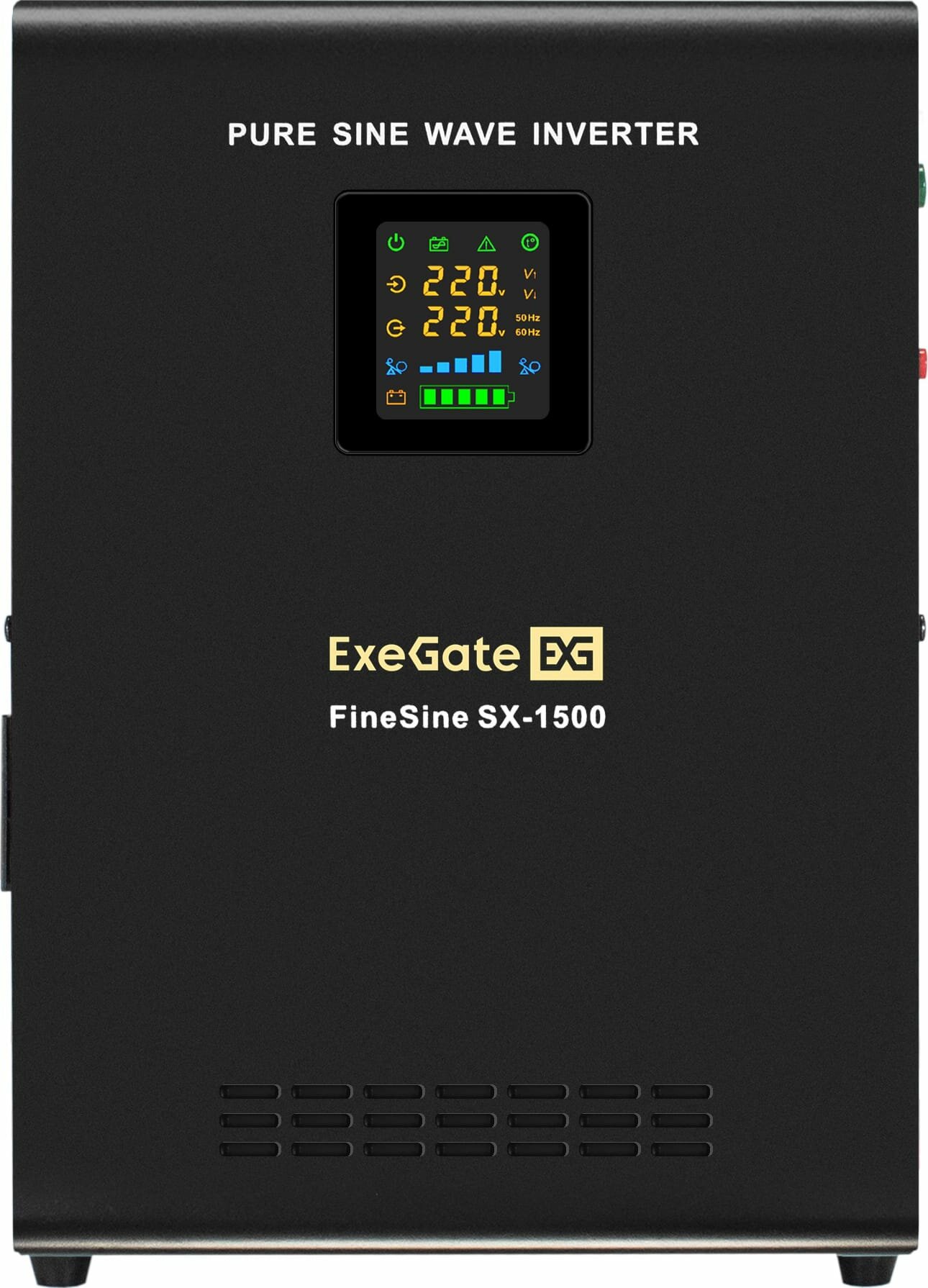 ИБП (инвертор, синус, для котла, настенный) ExeGate FineSine SX-1500. LCD. AVR.2SH <1500VA/1050W, чистая синусоида, цветной LCD-дисплей, AVR, 2*Schuko, линейно-интерактивный, внешняя батарея 24В до 200Ач (поставляется отдельно), Black> EX295998RUS