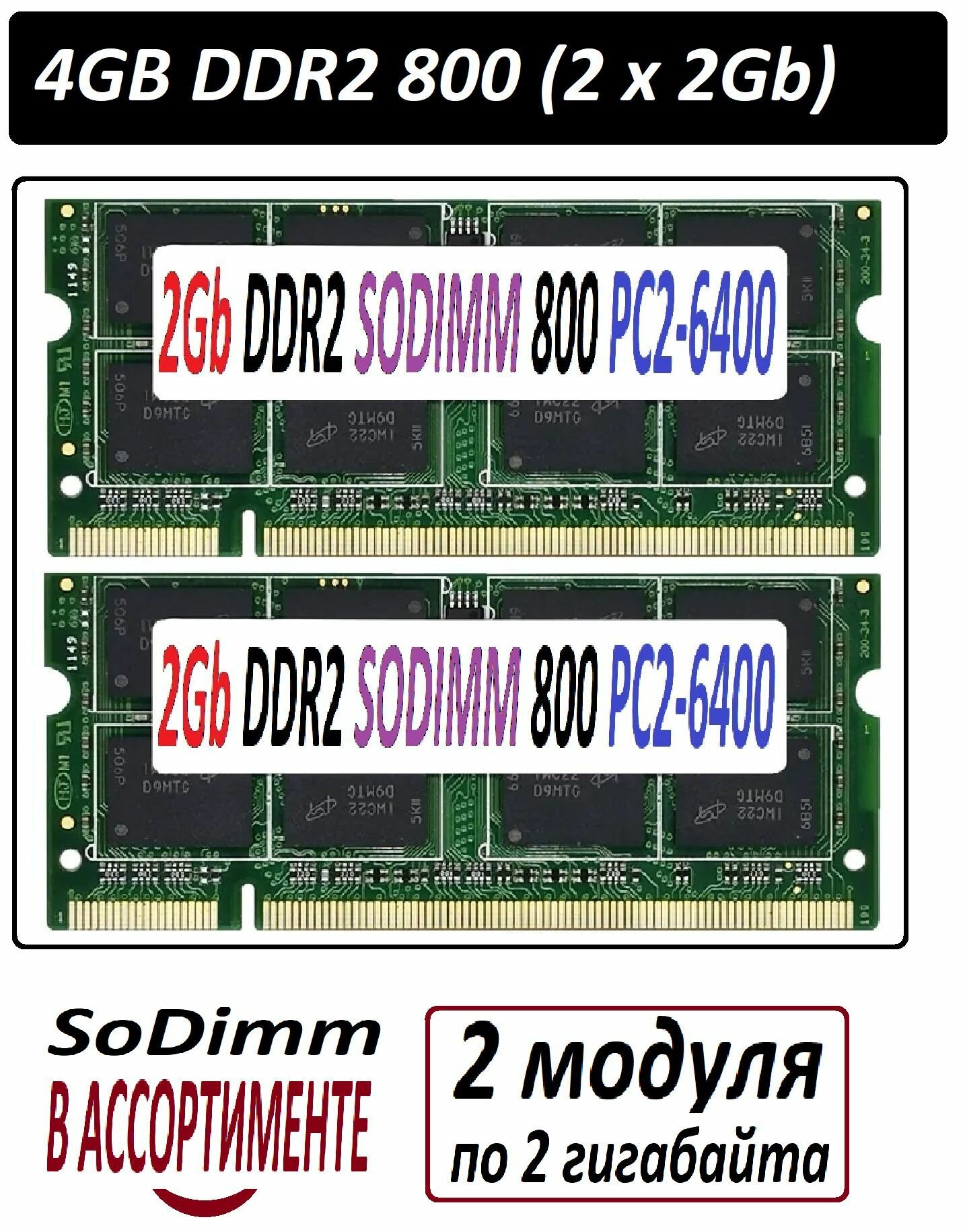 Купить Модули памяти 4gb (2x2Gb) ddr2 800 pc2-6400 SoDimm 2G для ноутбуков в ассортименте - 2 штуки