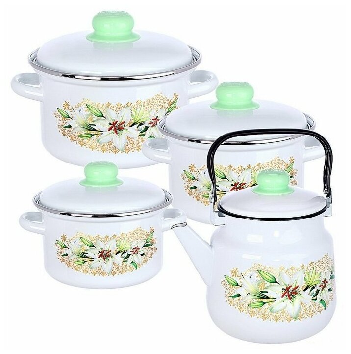 "Белая лилия" 2-3119/4, Набор эмалированной посуды (кастрюли с крышками: 2,0 л; 3,0 л; 4,0 л. Чайник: 3,5 л)