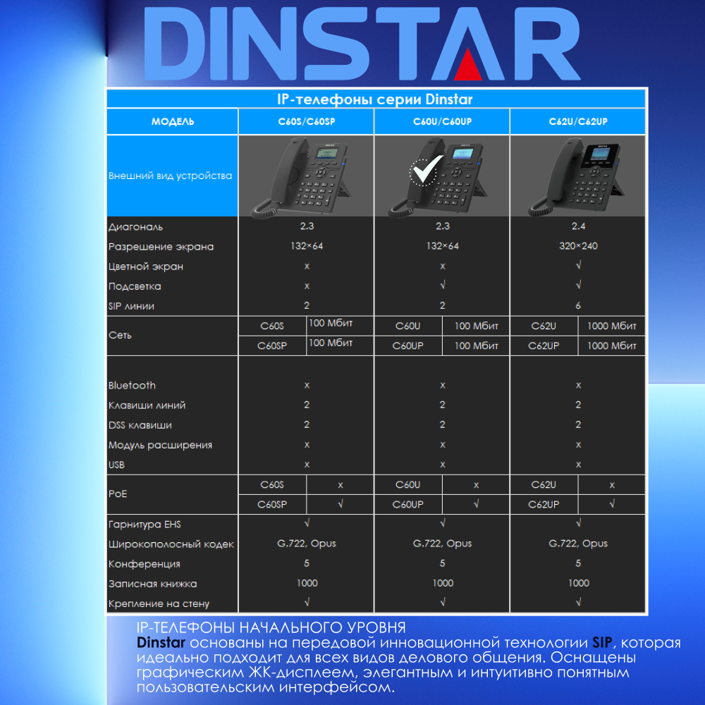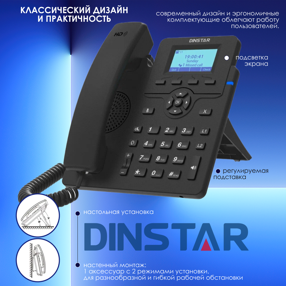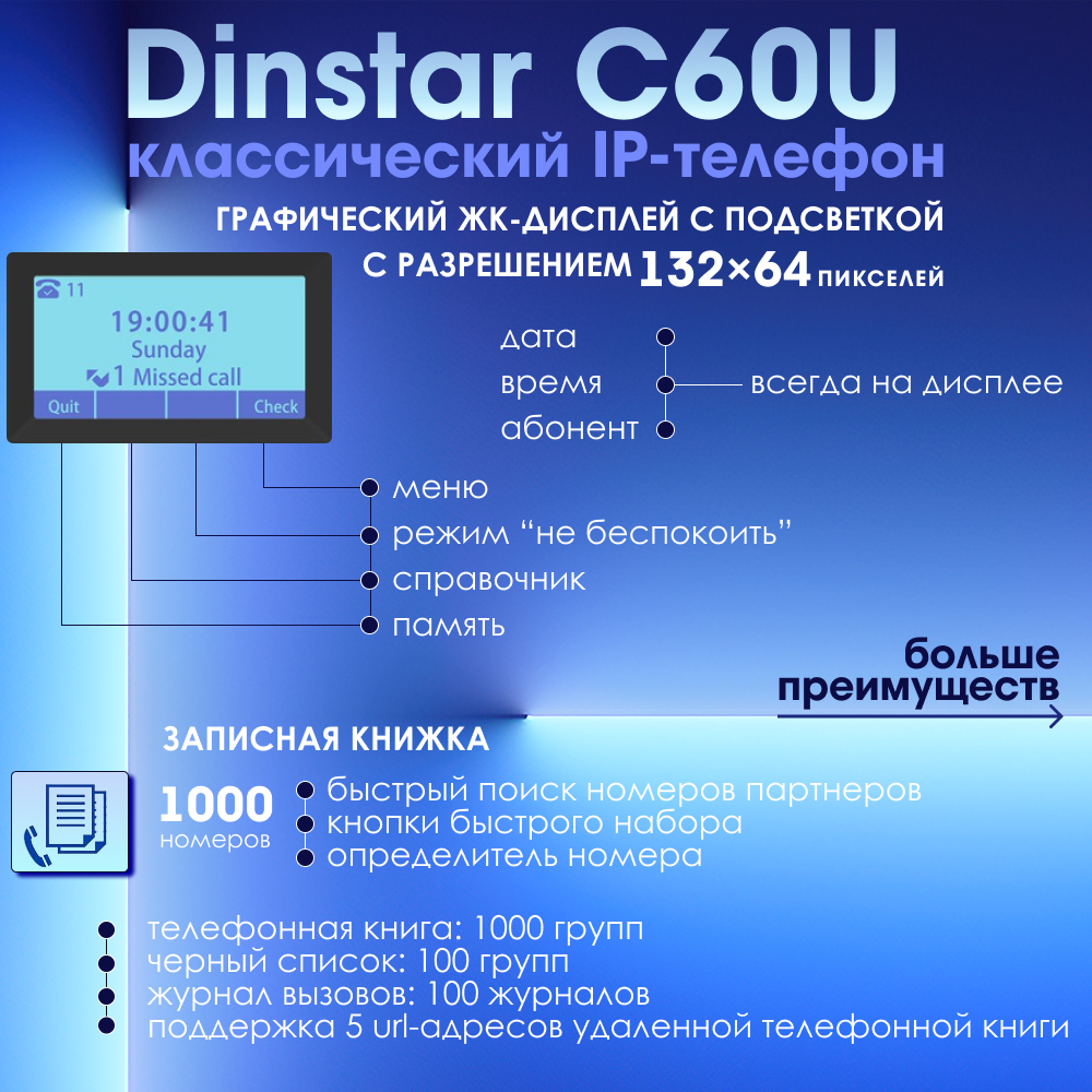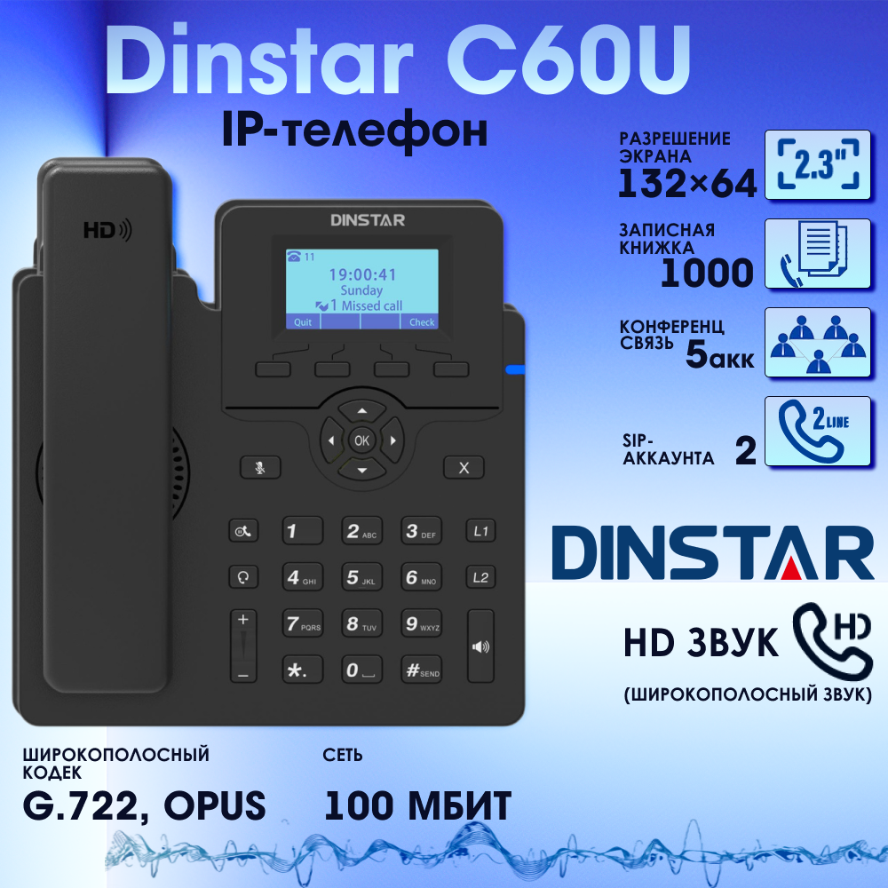 IP-телефон Dinstar C60U, 2 SIP аккаунта, монохромный дисплей 2,3 дюйма с подсветкой, конференция на 5 абонентов, поддержка EHS. интересное: