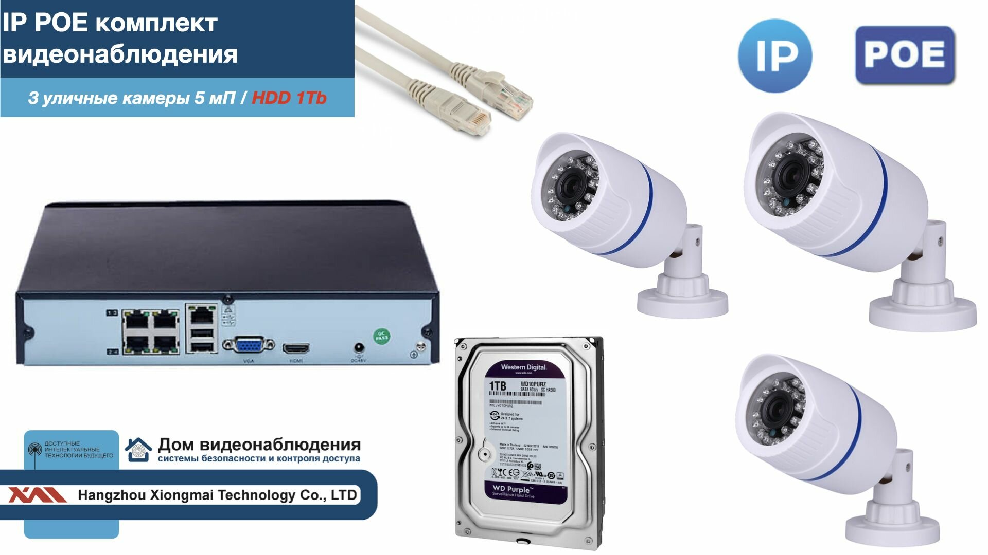 Полный IP POE комплект видеонаблюдения на 3 камеры (KIT3IPPOE100W5MP-2-HDD1Tb) интересное: