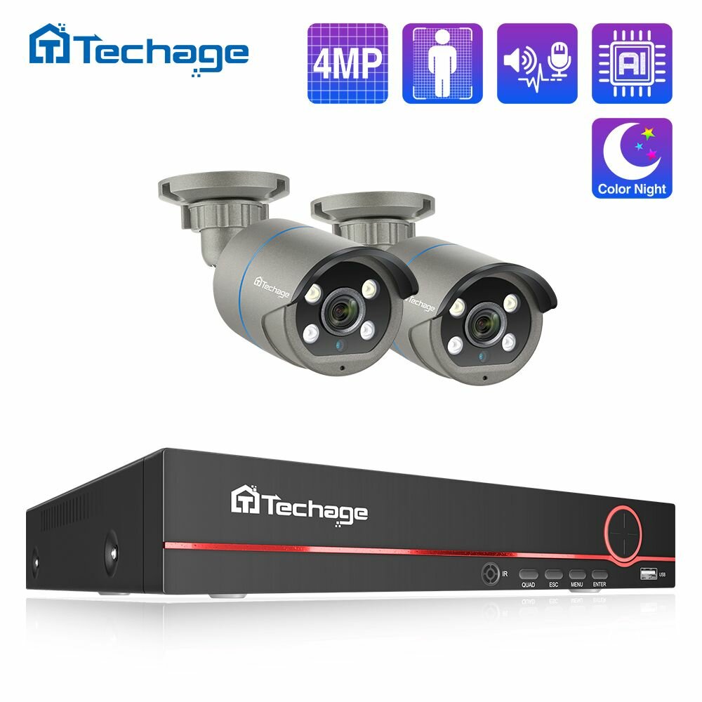 Купить Готовый комплект видеонаблюдения 8-канальная 2 уличные камерыкомплект видеонаблюдения уличная Techage 4Мп PoE-камера