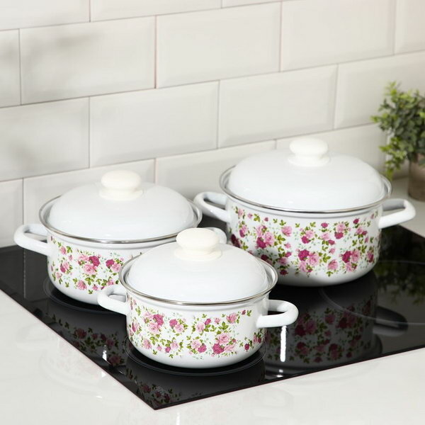 Лысьвенские эмали Набор кастрюль «Китайская роза», 3 предмета: 1,5 л, 2 л, 3 л, индукция, цвет белый