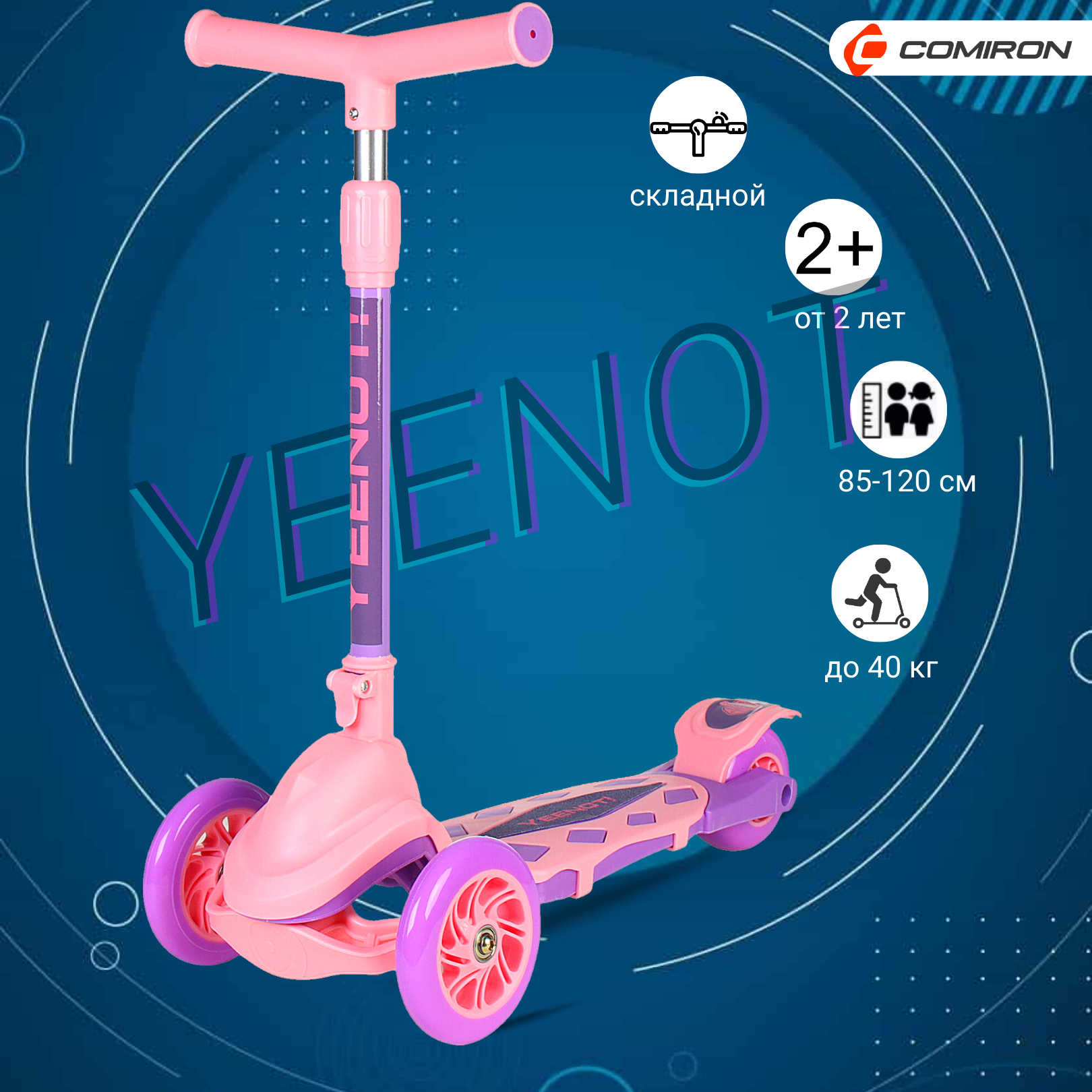 Самокат детский трехколесный COMIRON Yeenot "Зверята", регулируемая складная ручка, светящиеся колеса 110 и 75 мм, нагрузка до 40 кг, розовый / 1 шт.
