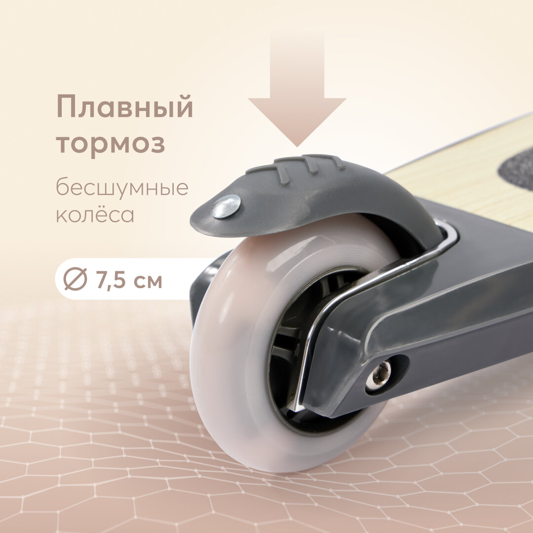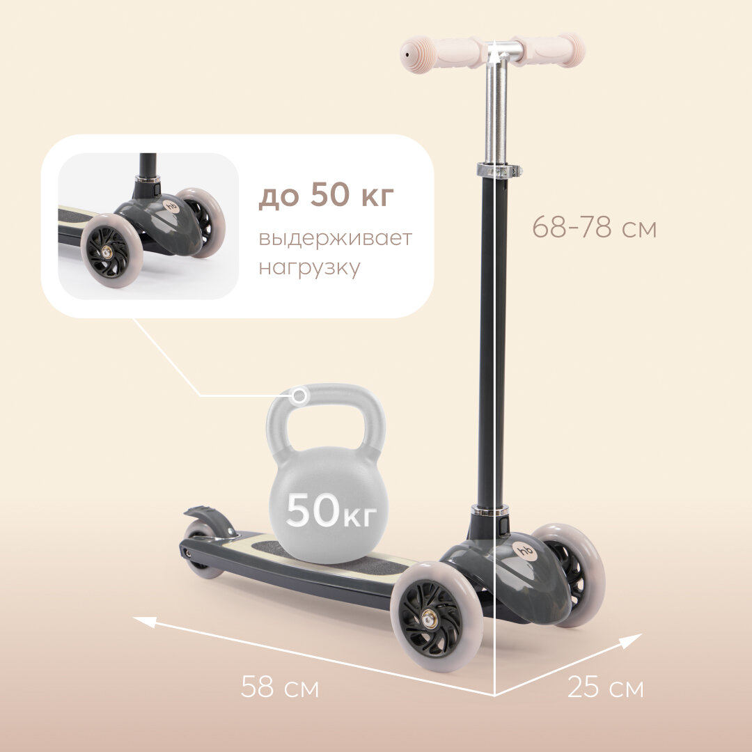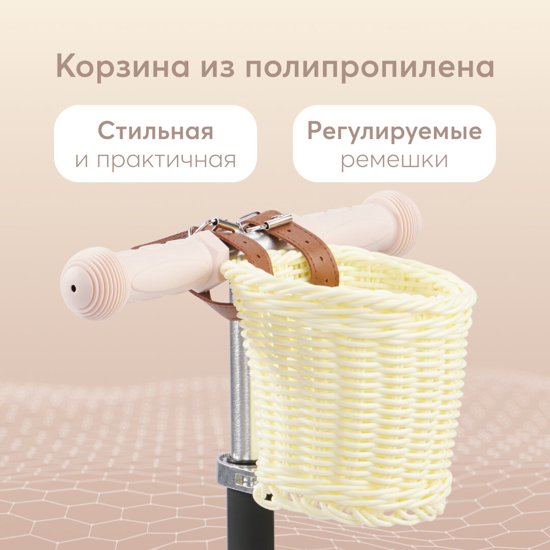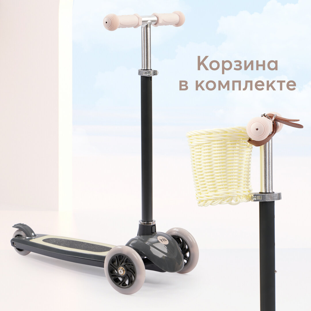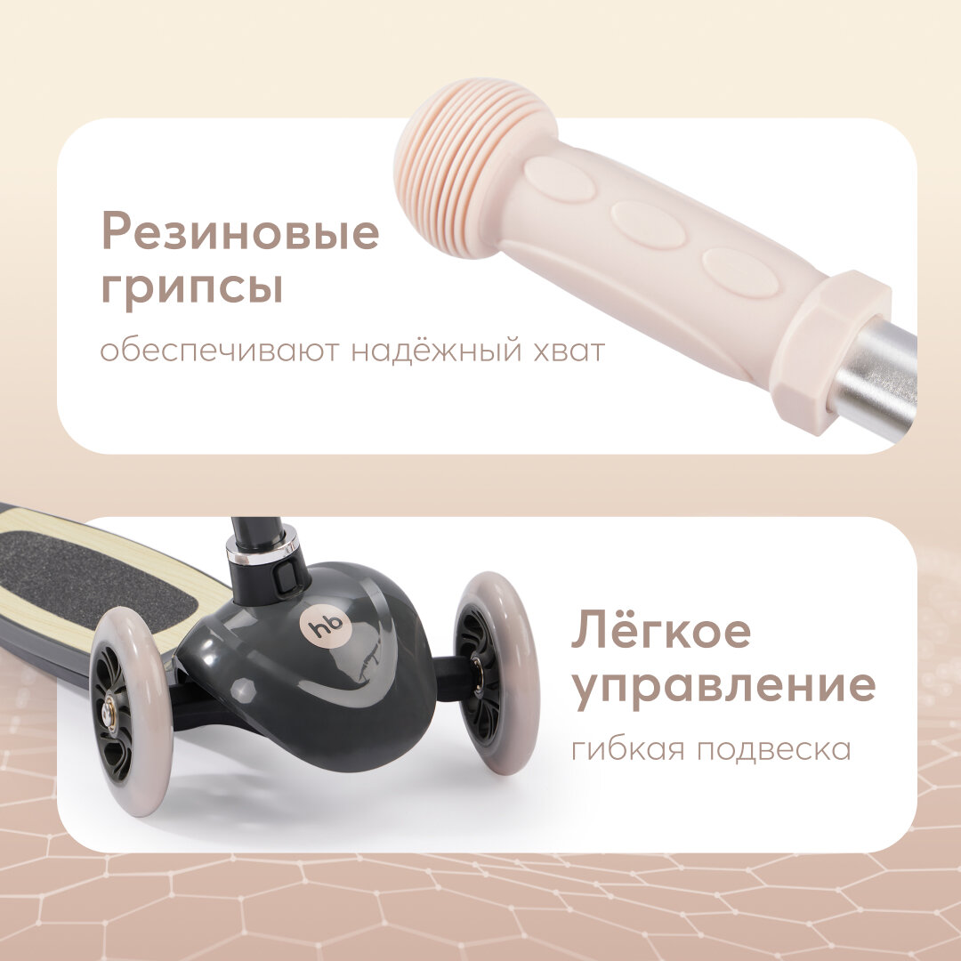 50035, Самокат Happy Baby TORNADO V2, со светящимися колесами, высота руля регулируется, со стикерами и корзиной, бежевый