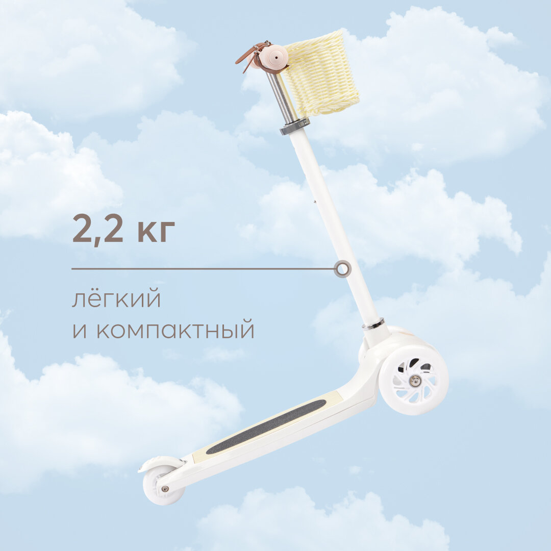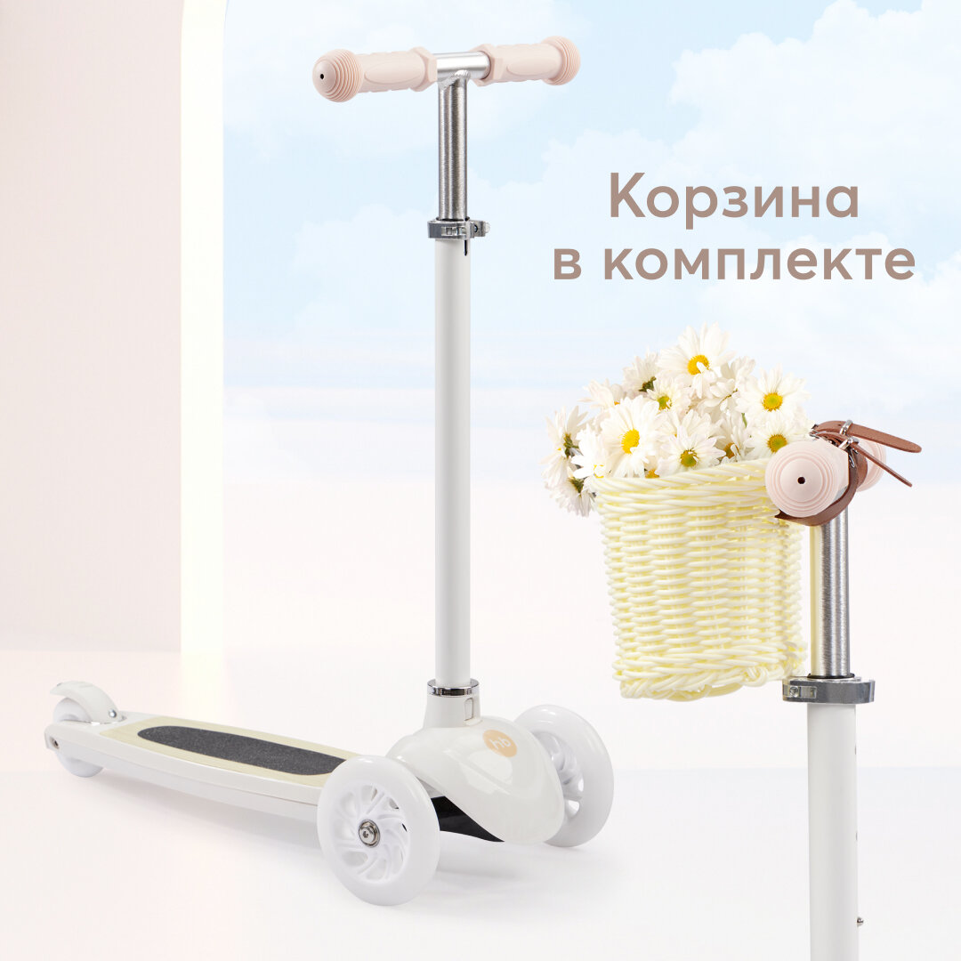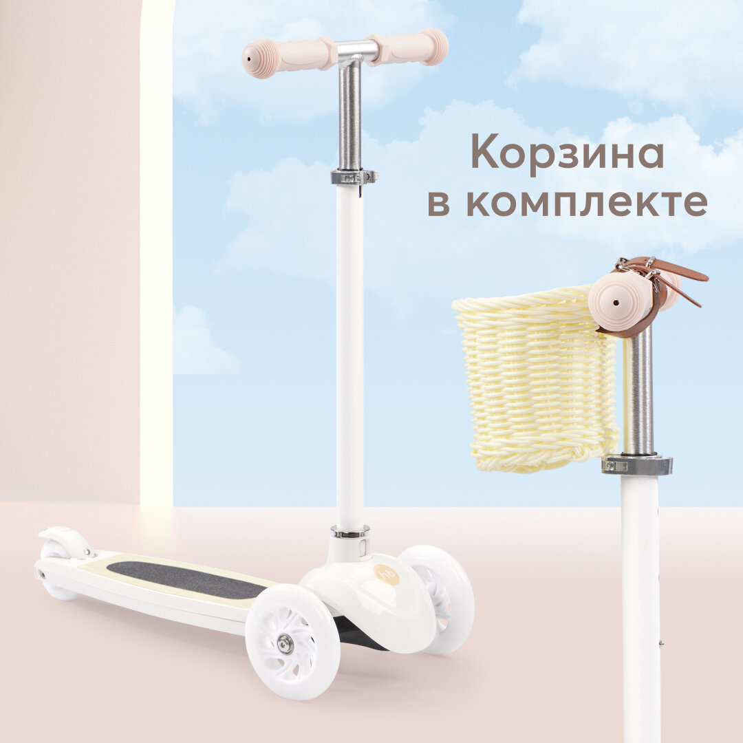 50035, Самокат Happy Baby TORNADO V2, со светящимися колесами, высота руля регулируется, со стикерами и корзиной, бежевый
