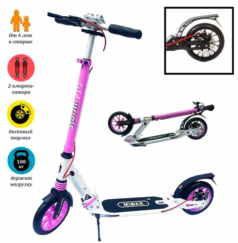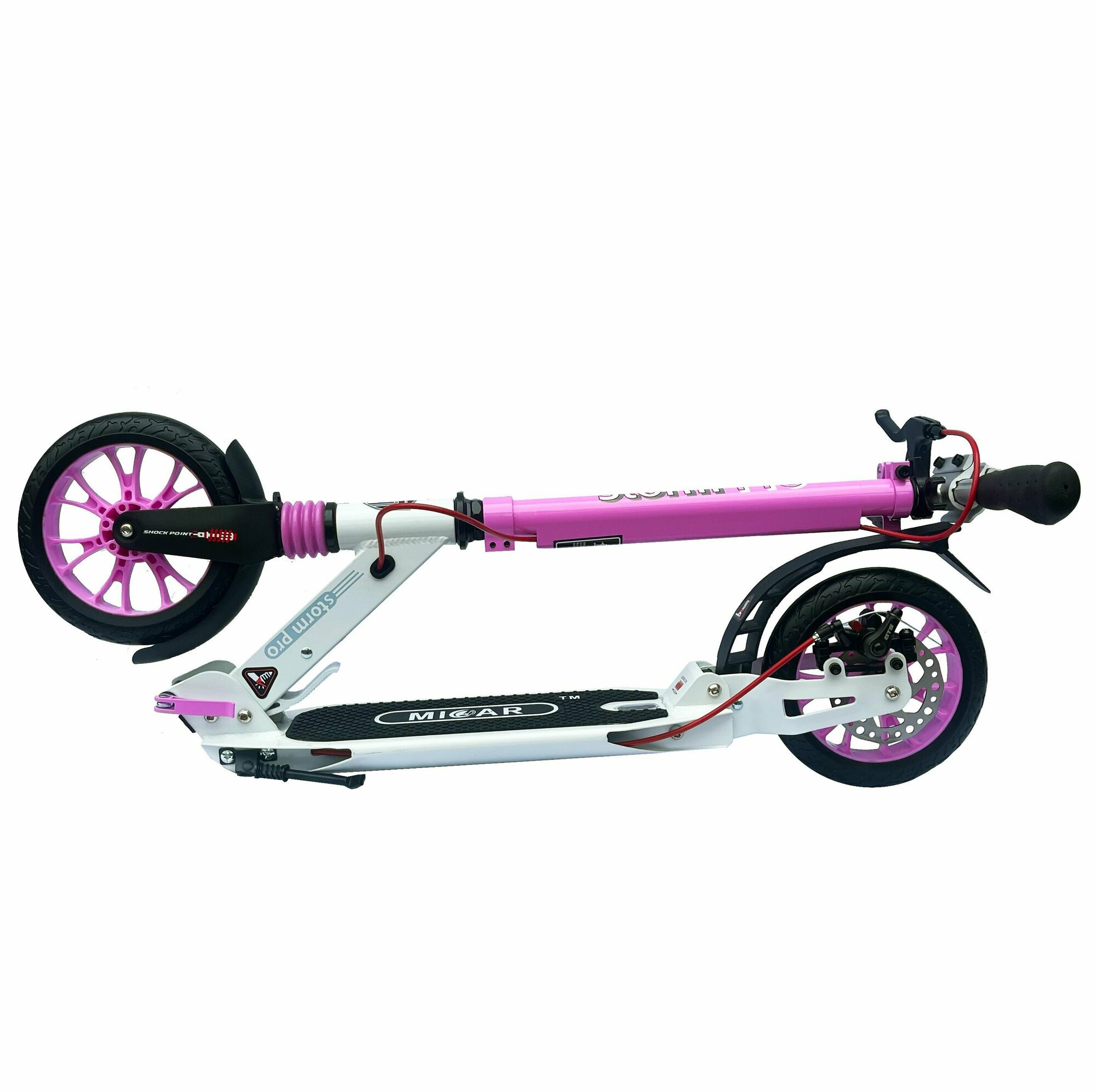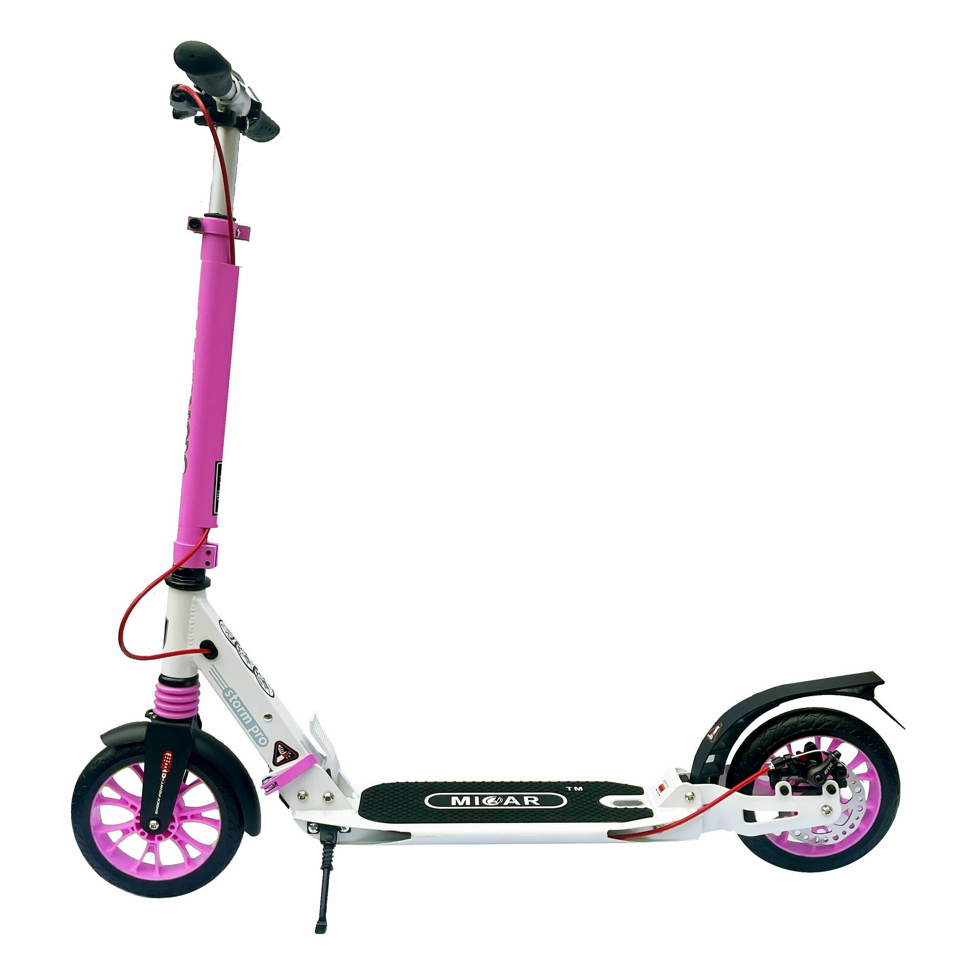 Купить Самокат двухколесный MICAR Storm Pro c колёсами 200 мм, складной с амортизаторами и ручным дисковым тормозом бело-розовый