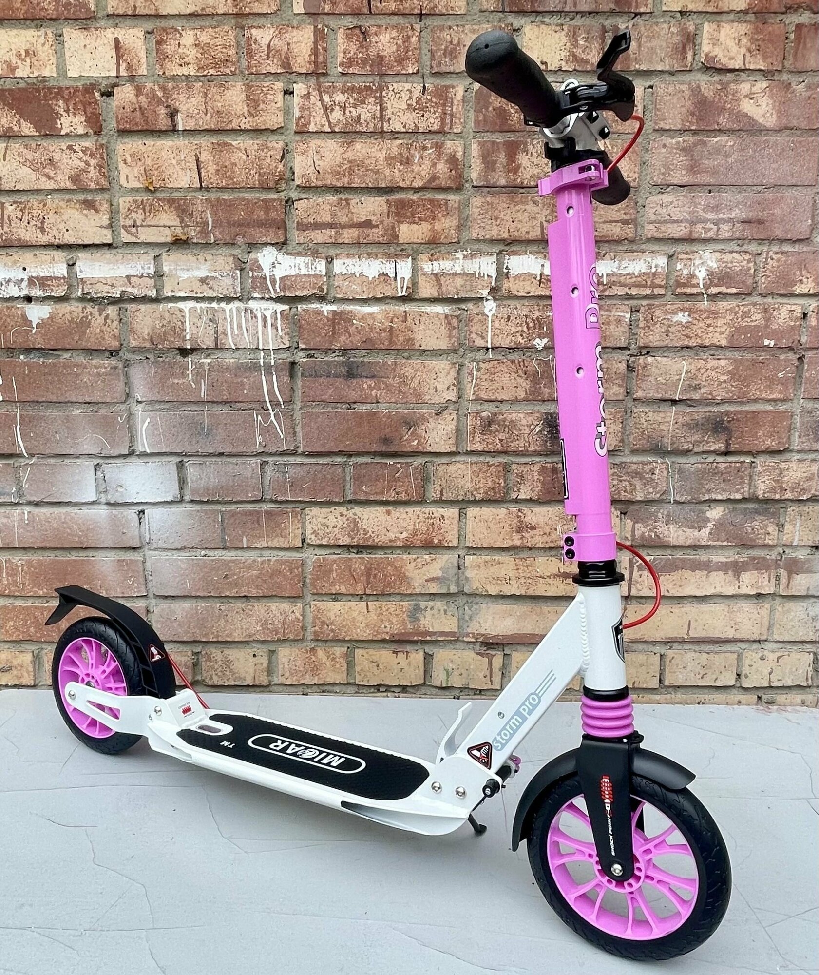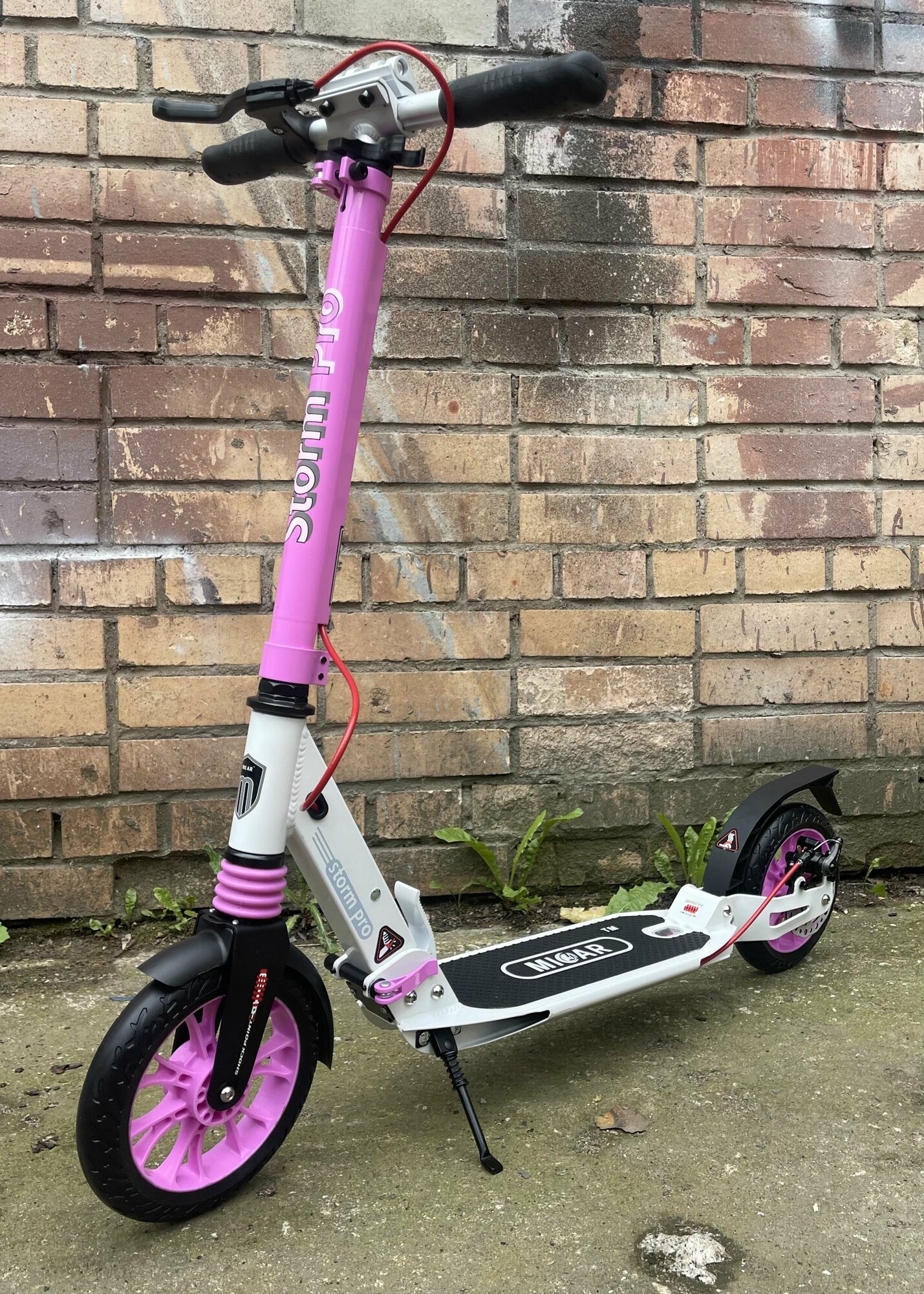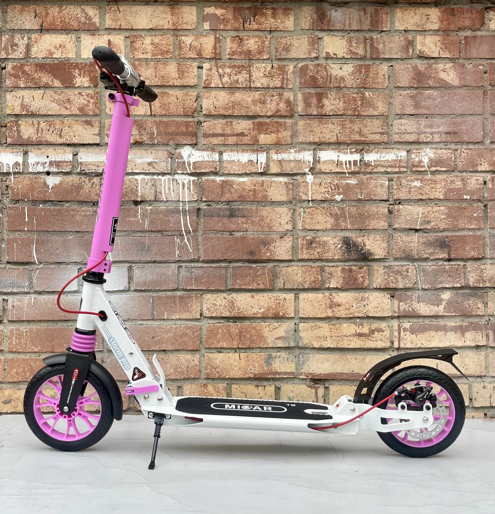 Купить Самокат двухколесный MICAR Storm Pro c колёсами 200 мм, складной с амортизаторами и ручным дисковым тормозом бело-розовый