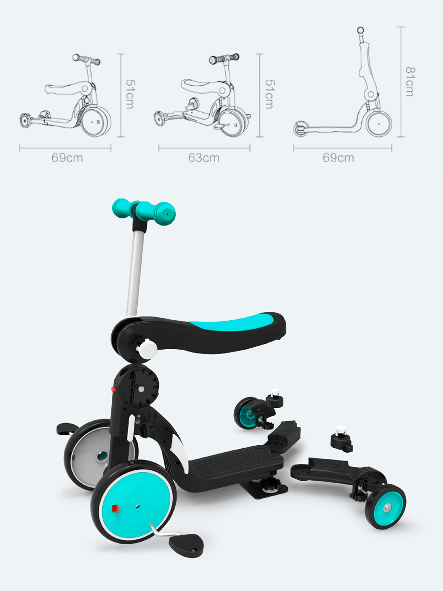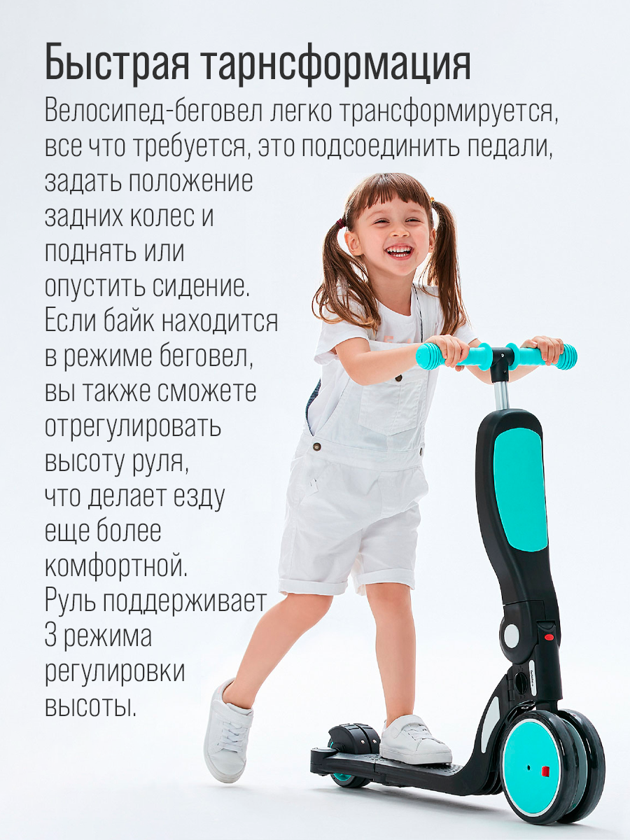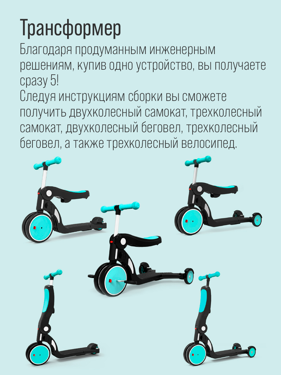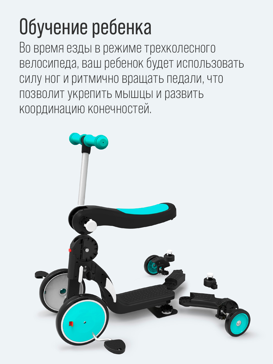 | Дополнительная информация | пять форм: трехколесный велосипед, трехколесный самокат, двухколесный самокат, трехколесный беговел, двухколесный бегове; подробная комплектация: педали 2 шт |