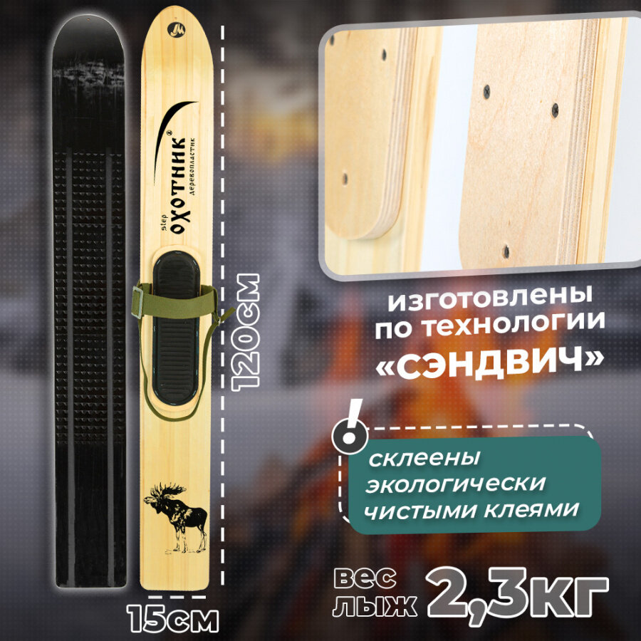 Лыжи охотничьи дерево-пластик Охотник 120 см с креплением кожа