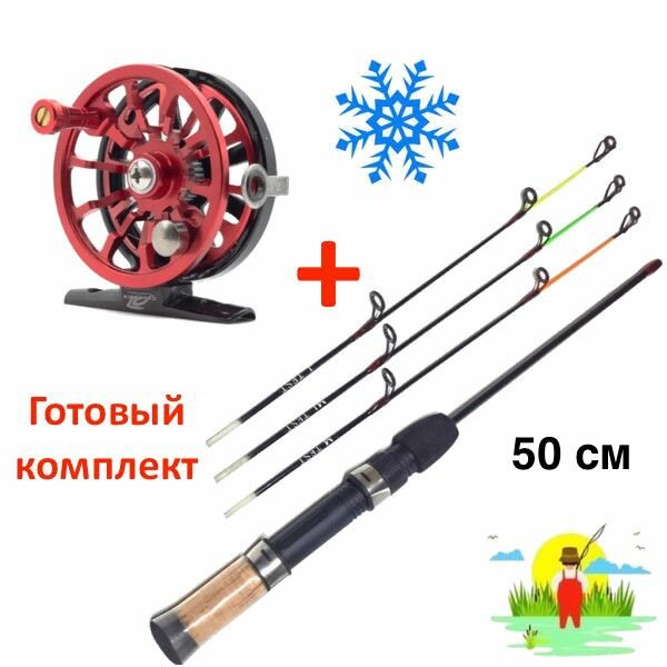 Комплект удочка зимняя CEiMAR Feeder 60см + катушка BLD60 красная / Фидер для зимней рыбалки, Катушка проводочная инерционная
