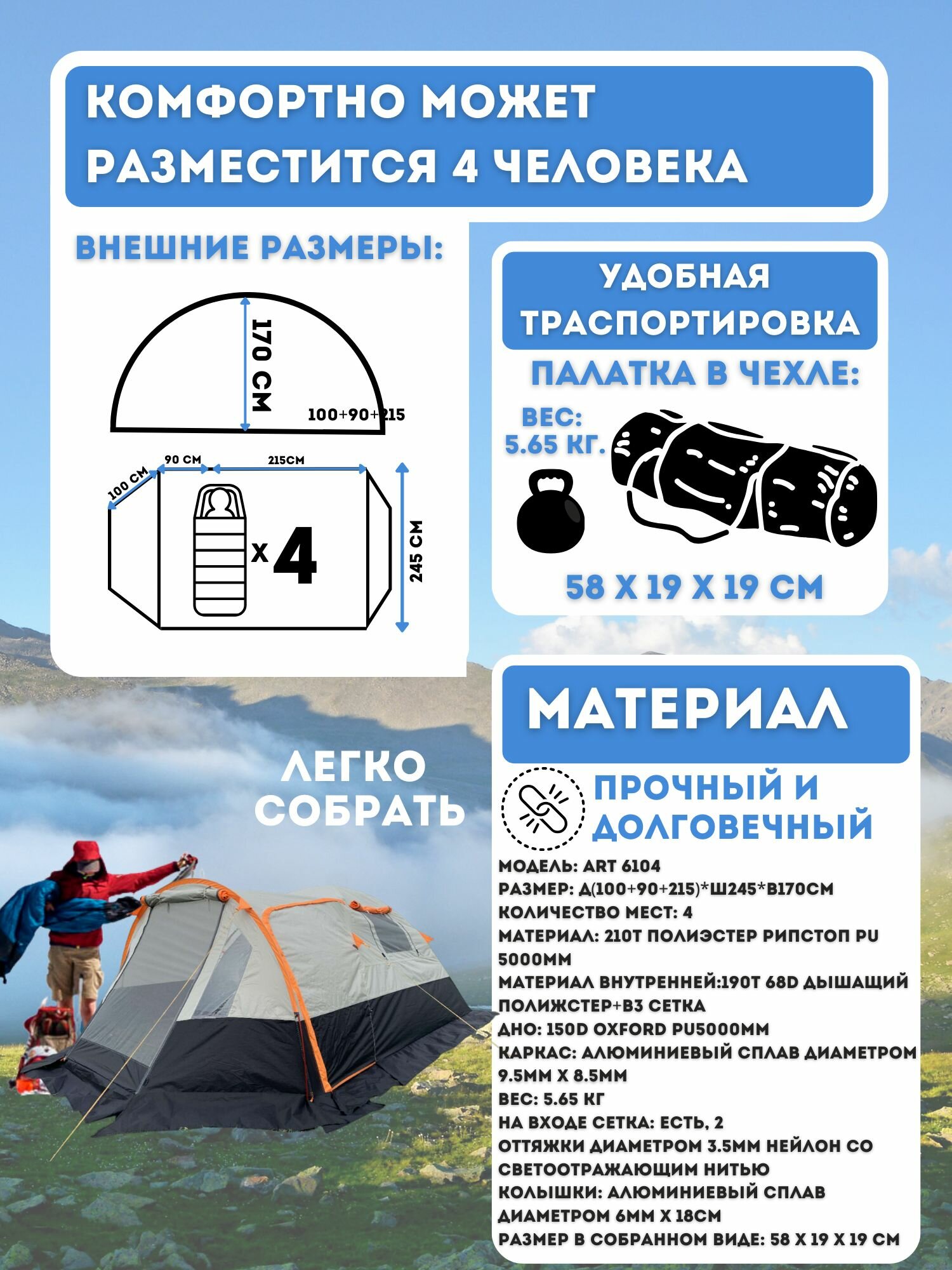 Ниже Вы можете прочитать отзывы на Туристическая палатка ART-6104 4-х местная MirCamping, ознакомится с подробными характеристиками, посмотреть интересные обзоры и фотографии на Туристическая палатка ART-6104 4-х местная MirCamping.
