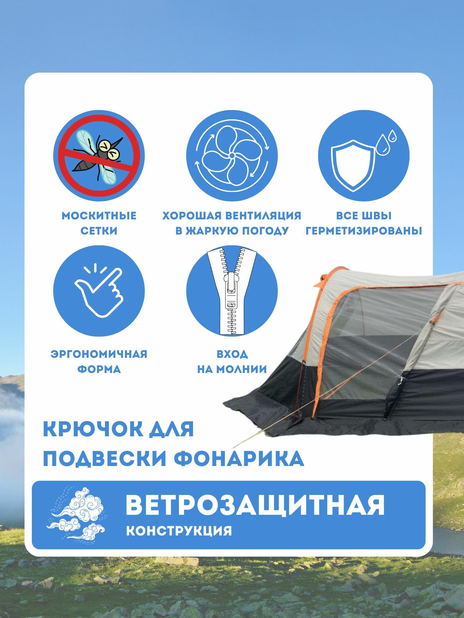 | Особенности | 1 комната / вентиляционные отверстия / ветрозащитная/снегозащитная юбка / внутренние карманы / внутренняя палатка / Возможность крепления фонарика / колышки / огнеупорная пропитка / окна / проклеенные швы / противомоскитная сетка / тамбур / тент / штормовые оттяжки |