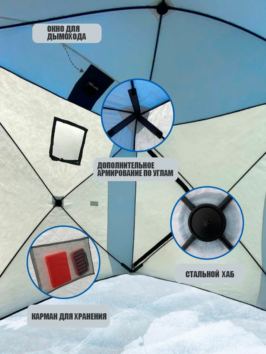 | Особенности | 1 комната / вентиляционные отверстия / ветрозащитная/снегозащитная юбка / внутренние карманы / окна / проклеенные швы / усиленные углы |