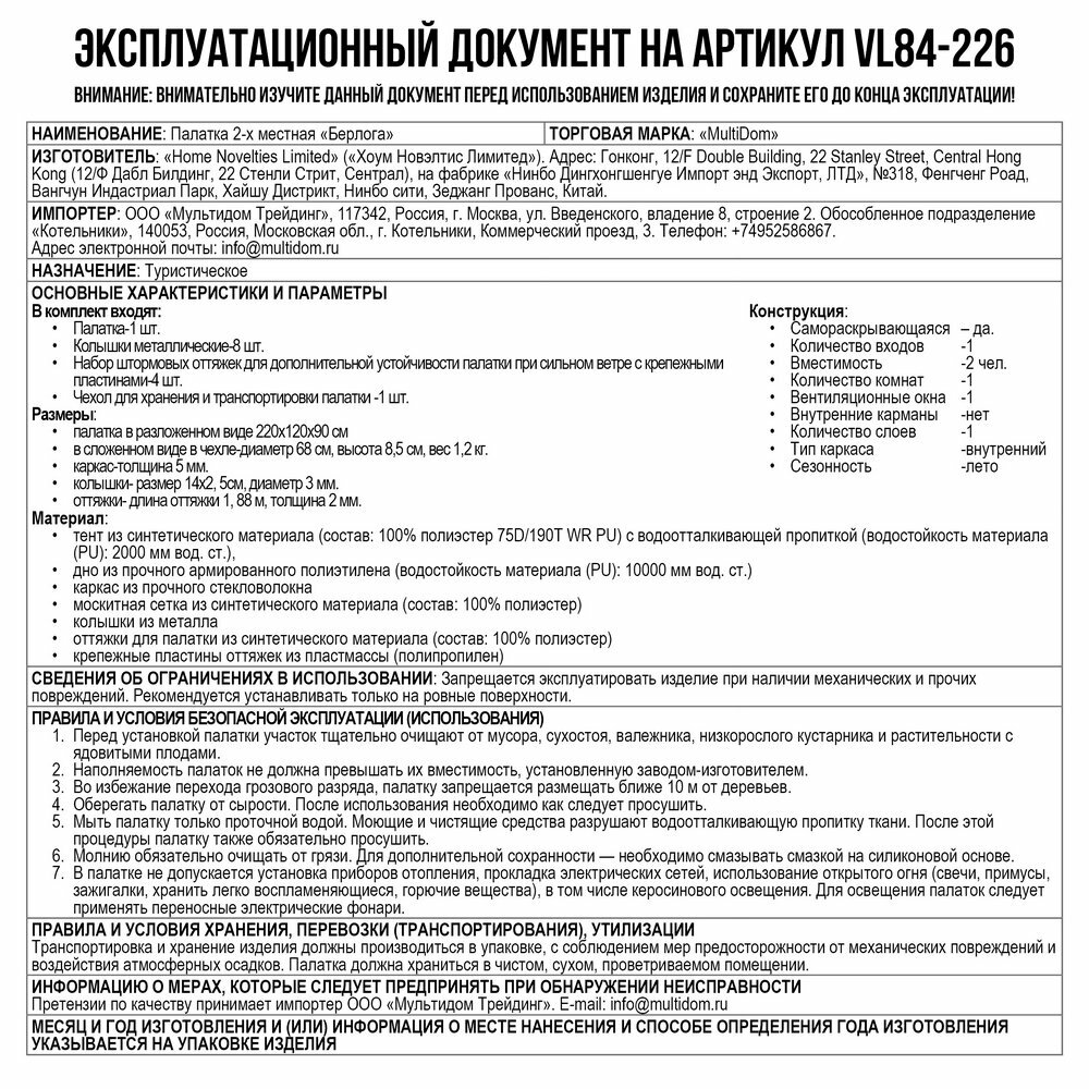 | Особенности | 1 комната / вентиляционные отверстия / колышки / противомоскитная сетка / штормовые оттяжки |