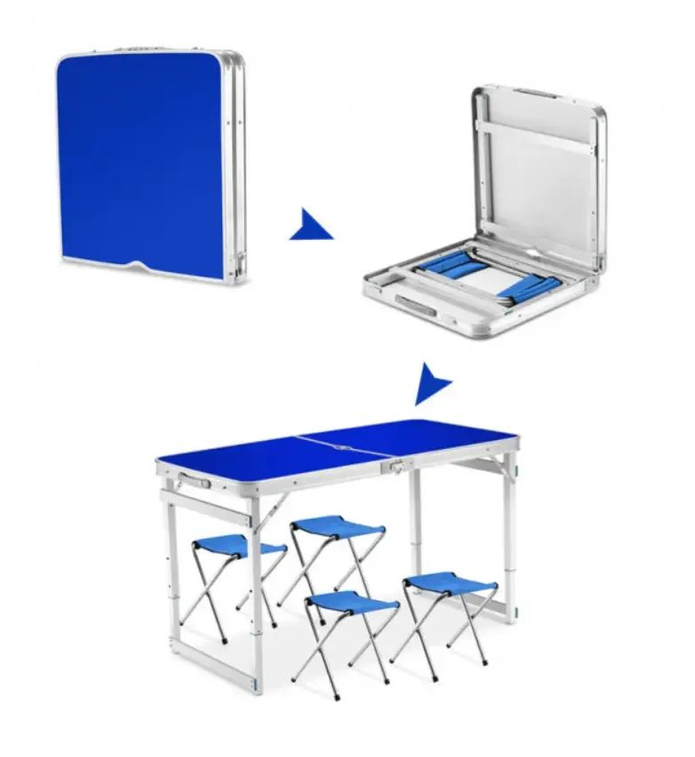 Складной туристический стол из металла, длина 120 см.х 60 см. 4 стула в комплекте 27х23х35 см. интересное: