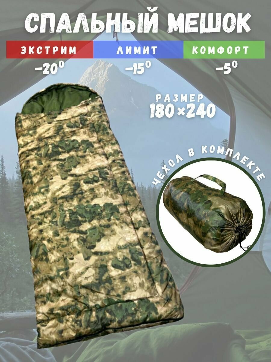 Спальный мешок армейский/туристический, зимний/демисезонный камуфляж МОХ/соты, комфорт -5С, экстрим -25С. Размер: 220х90 интересное: