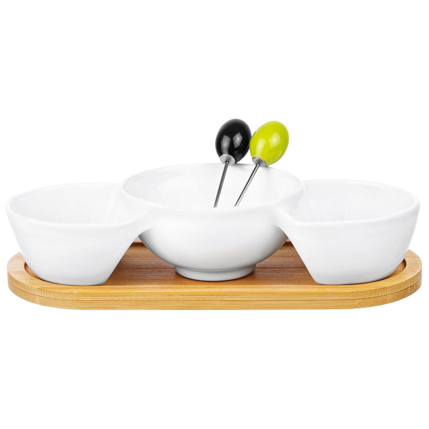 Купить Блюдо - менажница фарфоровая с 3 секциями 22х9,5х5,8 см Elan Gallery Айсберг на деревянной подставке с 2 шпажками