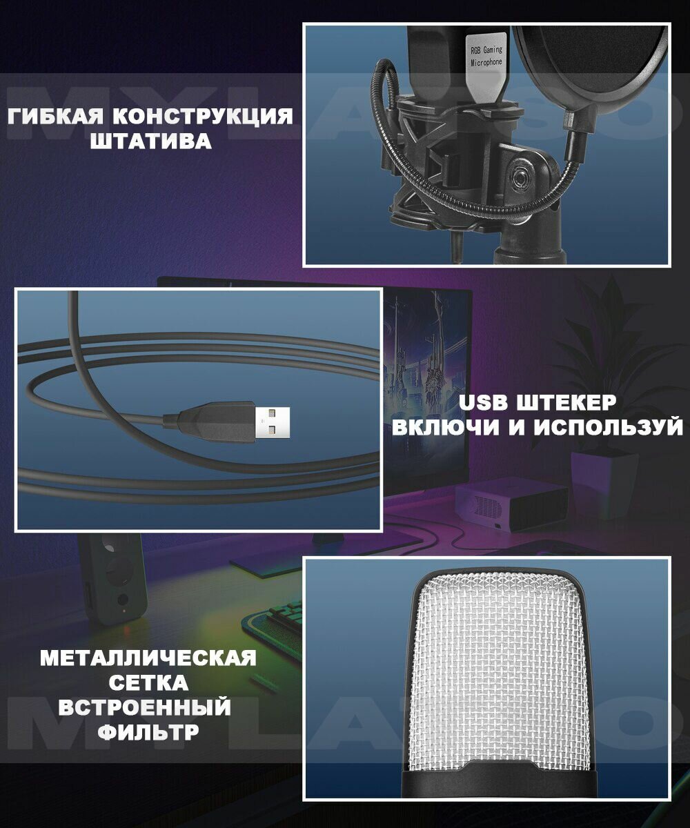 Конденсаторный проводной микрофон для ПК игровой, студийный с подсветкой и USB интересное: