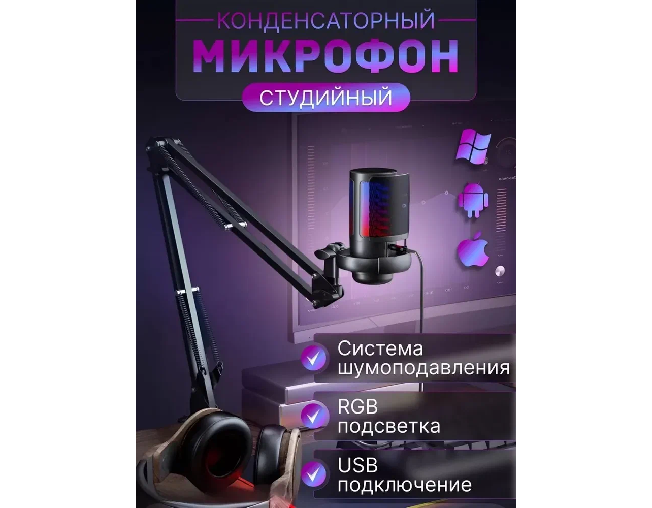 Микрофон для компьютера игровой с поп-фильтром, конденсаторный, с RGB подсветкой, микрофон игровой, для стриминга, usb микрофон