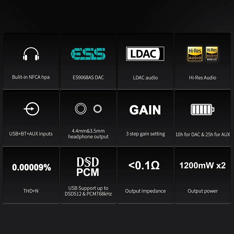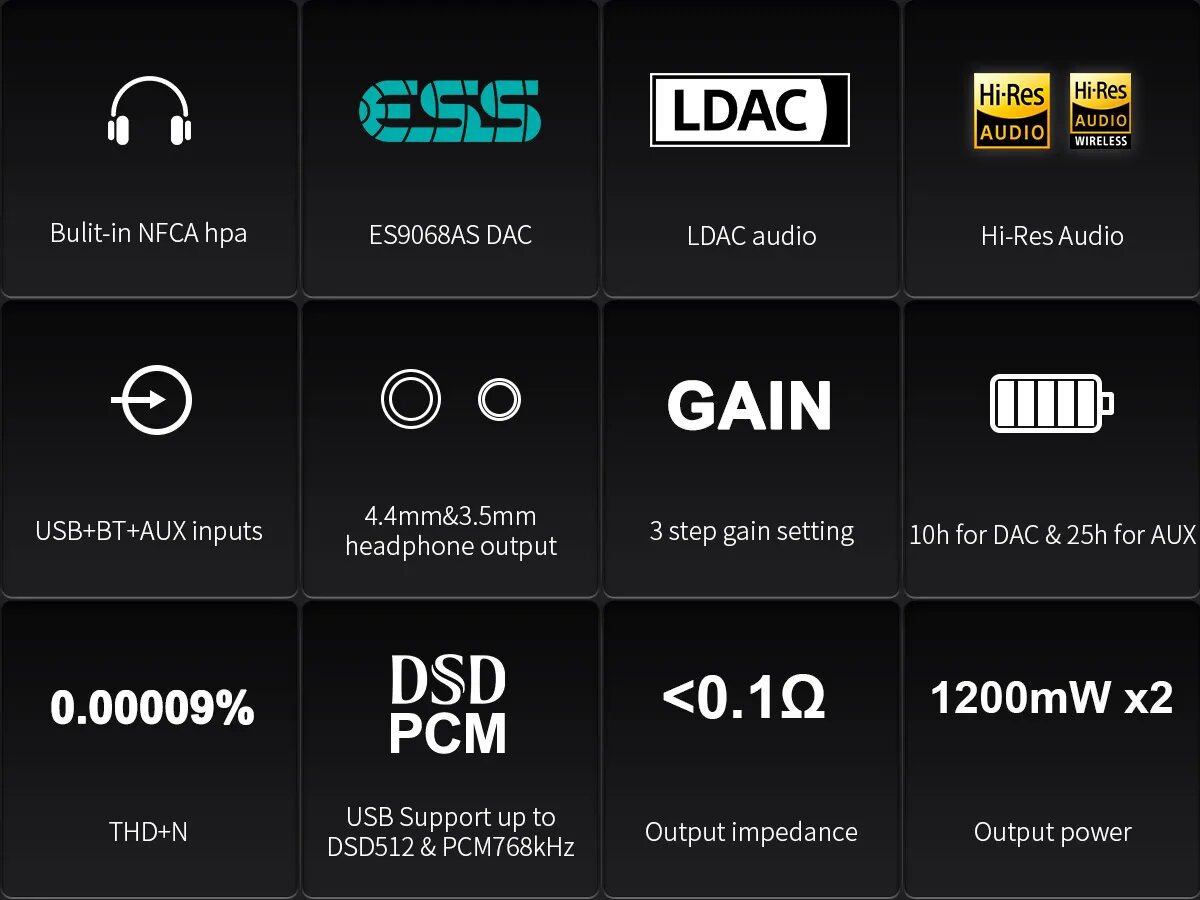 | Дополнительная информация | NFCA (композитный усилитель с обратной связью); 10 часов работы через подключение DAC, 25 часов работы через подключение AUX |